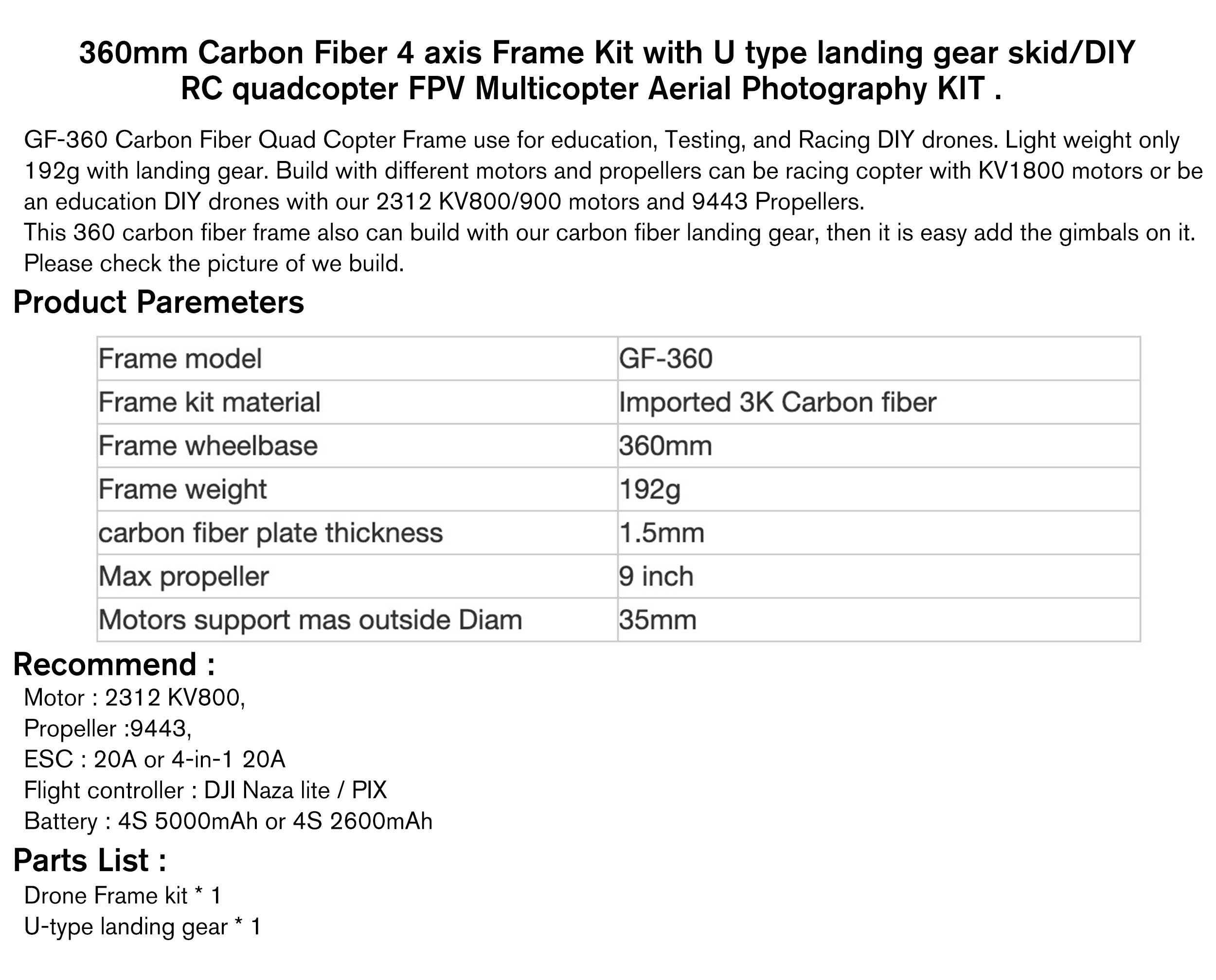 360mm Carbon Fiber 4 axis Frame Kit with U type landing gear skid/DIY RC quadcopter FPV Multicopter Aerial Photography KIT