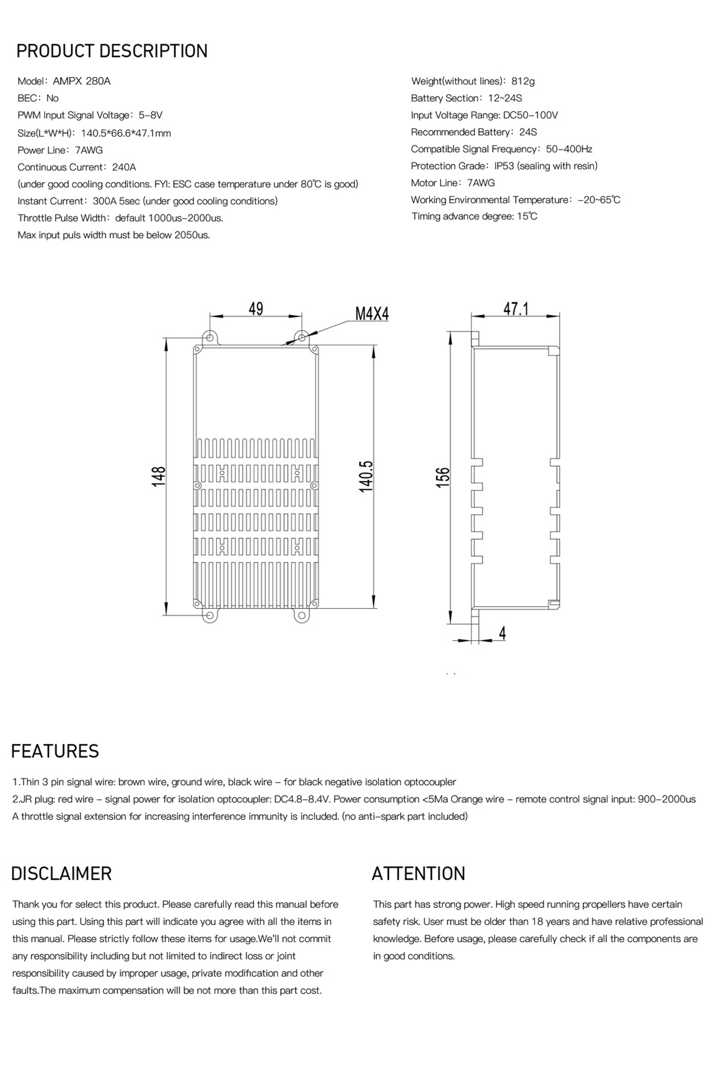 MAD AMPX 280A(12-24S) ESC Regulator 44V-100V Brushless Motor Controller For Manned Delivery Drone