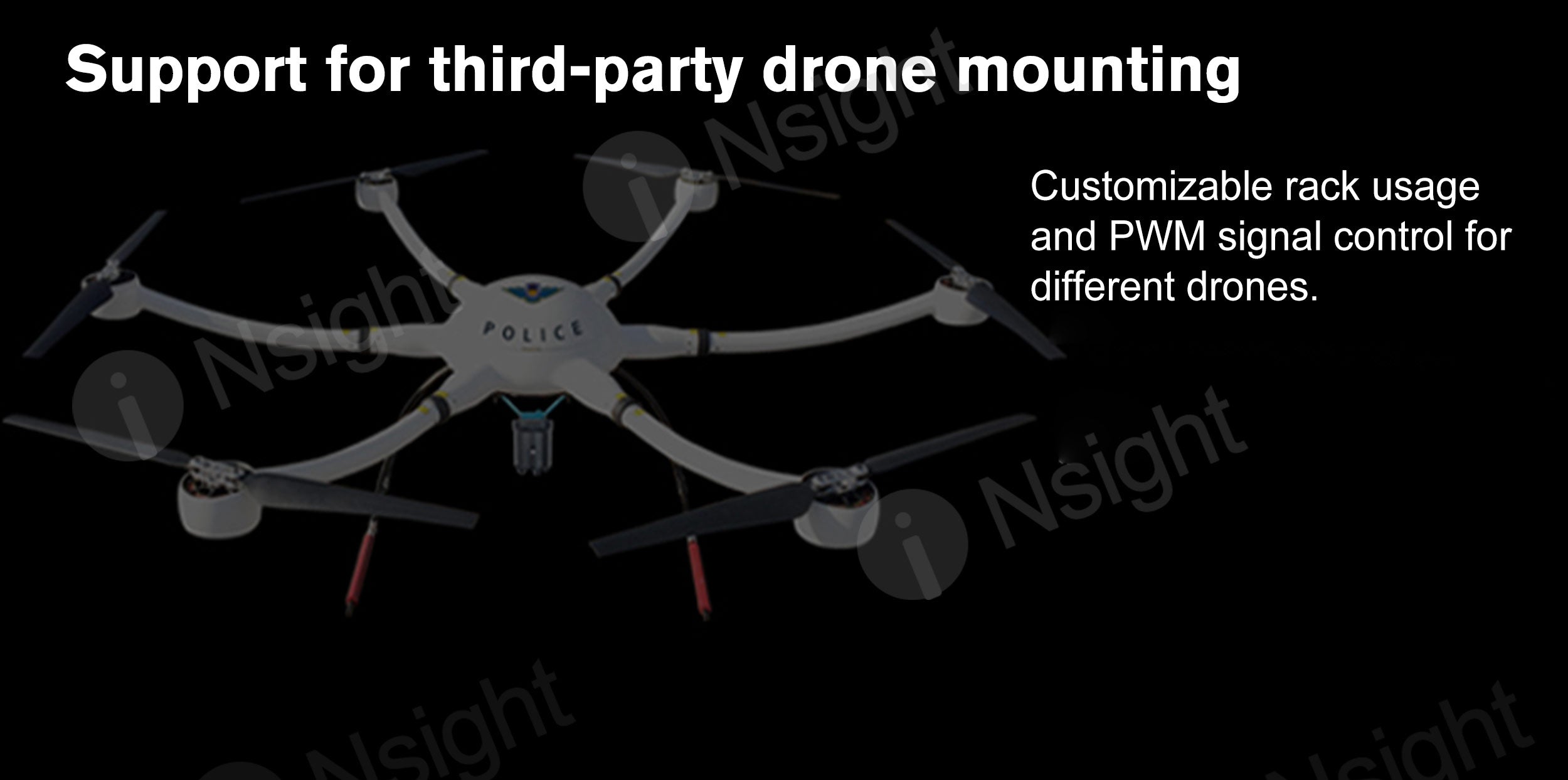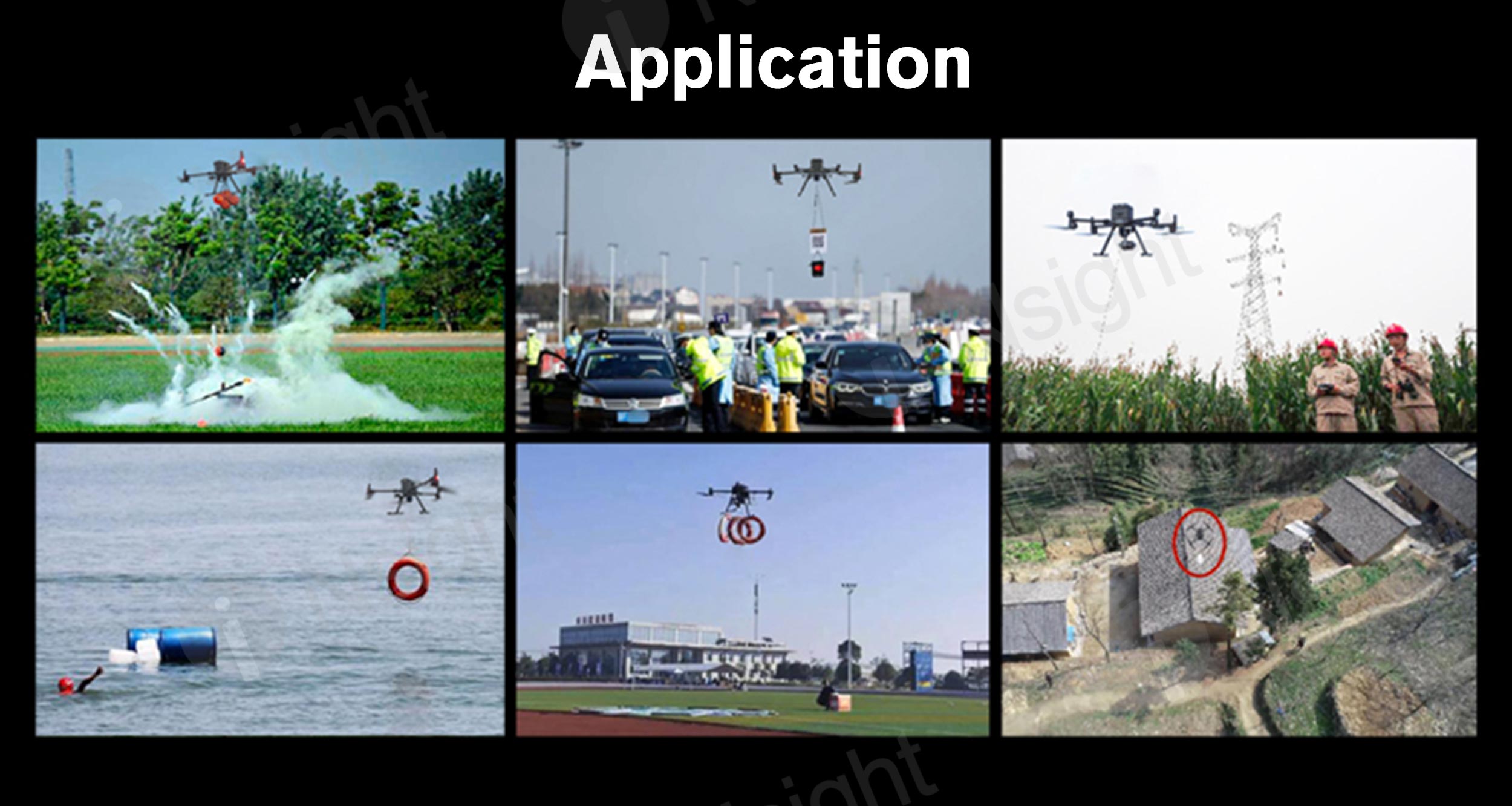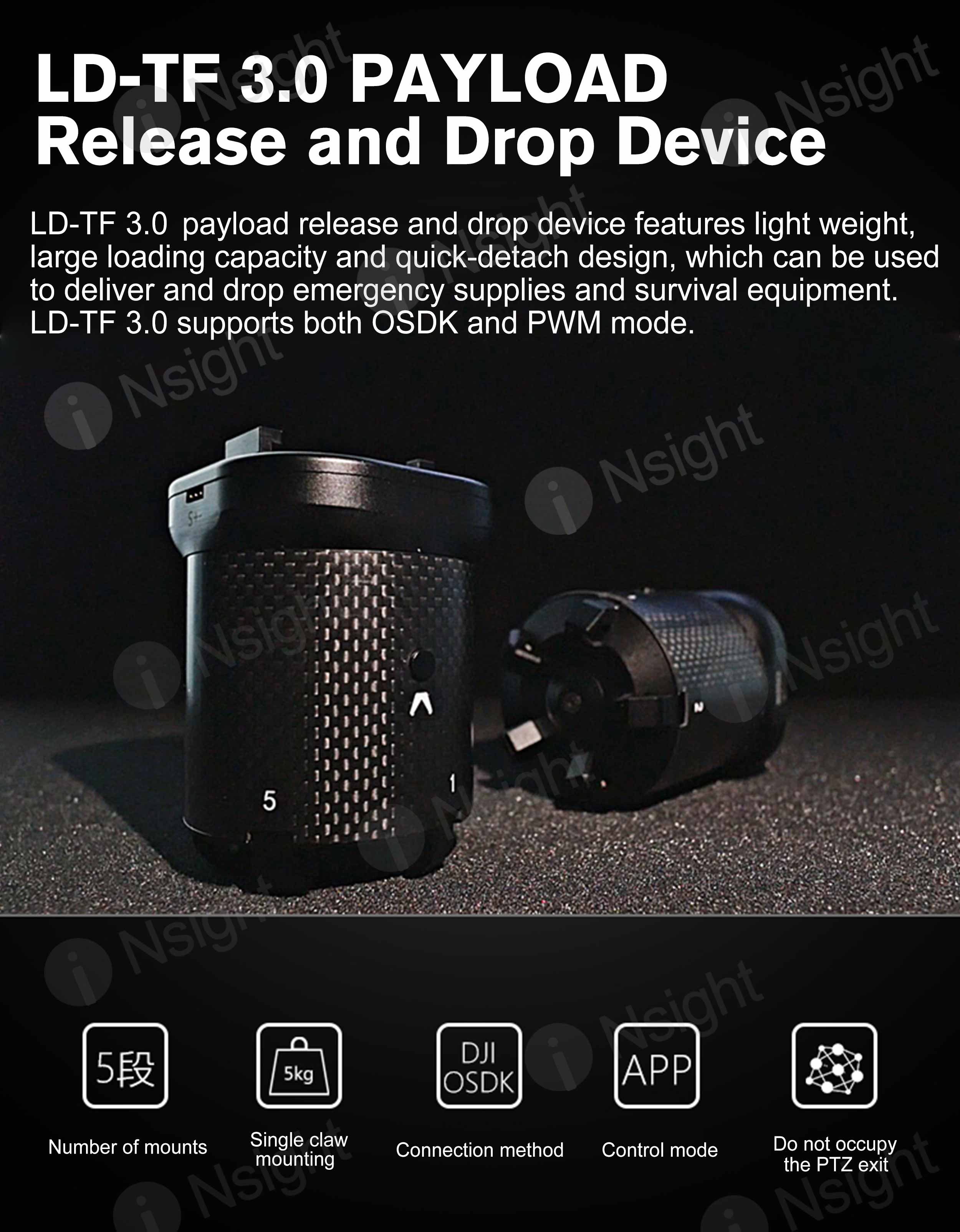 RDD-5 5-hook payload release and drop device features light weight, large loading capacity and quick-detach design, which can be used to deliver and drop emergency supplies such as food, medicine, communication and survival equipment. RDD-5 payload release and drop device supports both OSDK and PWM mode.
