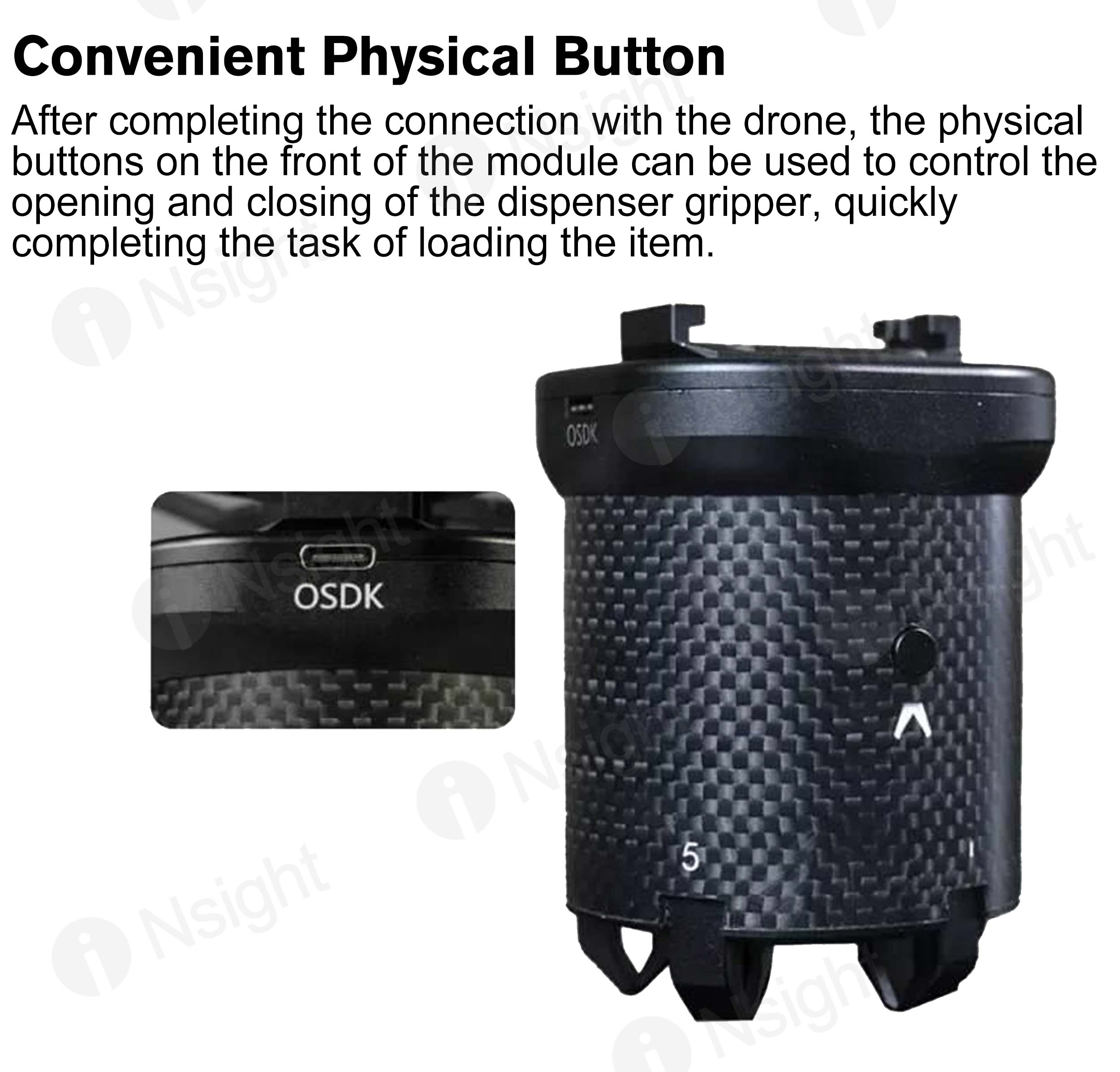 The RDD-5 drop device OSDK mode adopts OSDK+APP control method, breaking the limitation of control distance, and does not occupy the gimbal interface, so it can work with gimbal camera at the same time; The RDD-5 PWM mode is compatible with other UAVs that support PWM signal, the operation range of the device is the same as the drone radio controller.