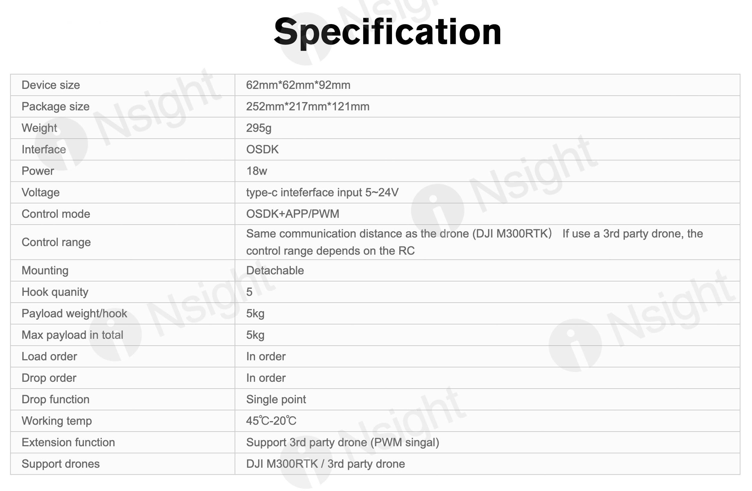 The aviation aluminum and carbon fiber material make the device light but durable. The weight of RDD-5 is only 295g, it has 5 loading hooks and can load Max.25kg (5kg/hook). The device can be controlled both by OSDK and PWM signal.