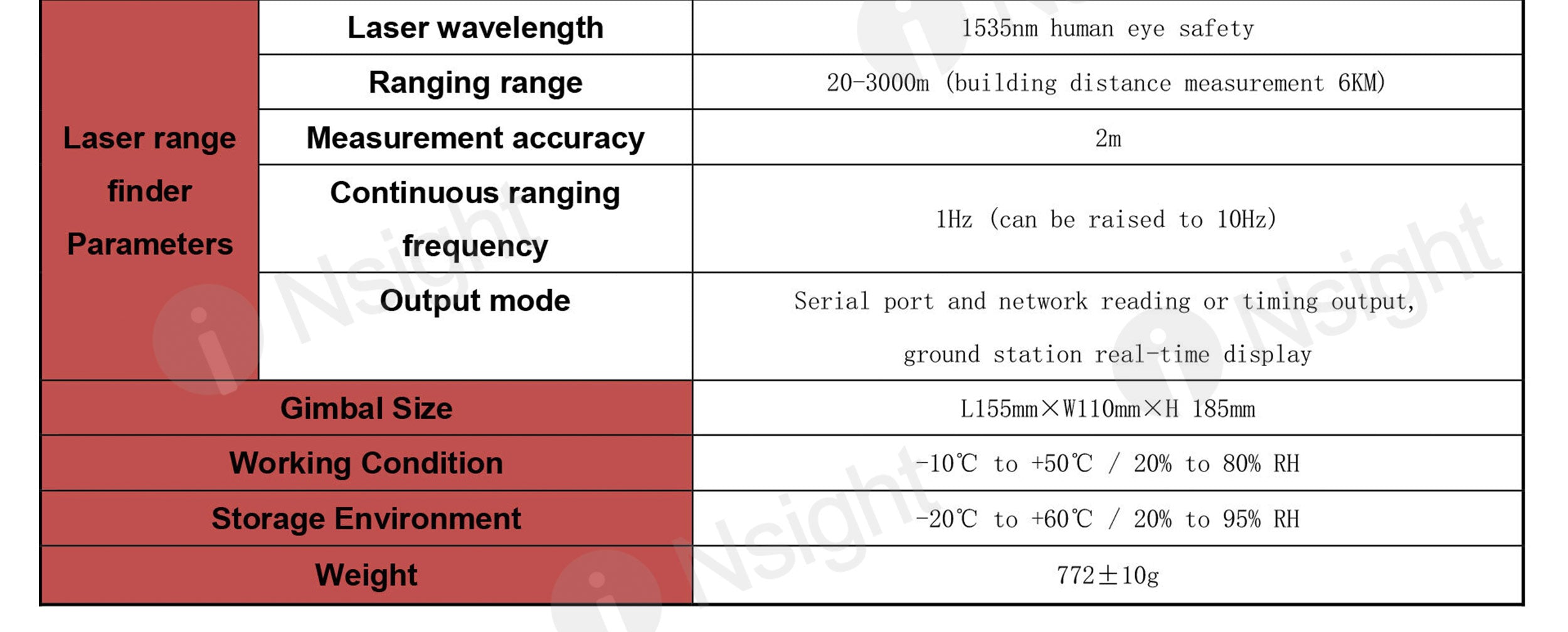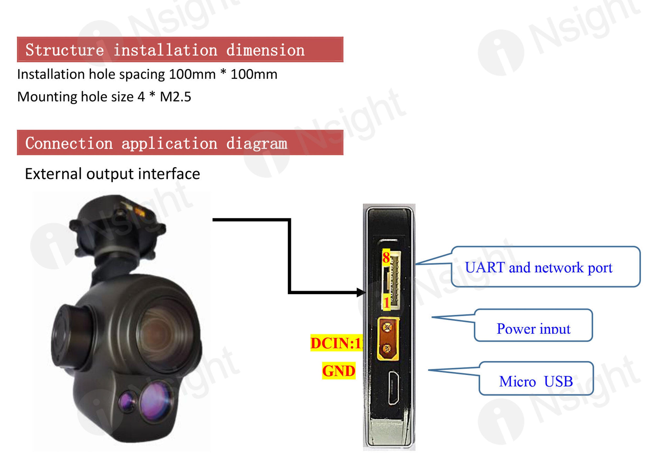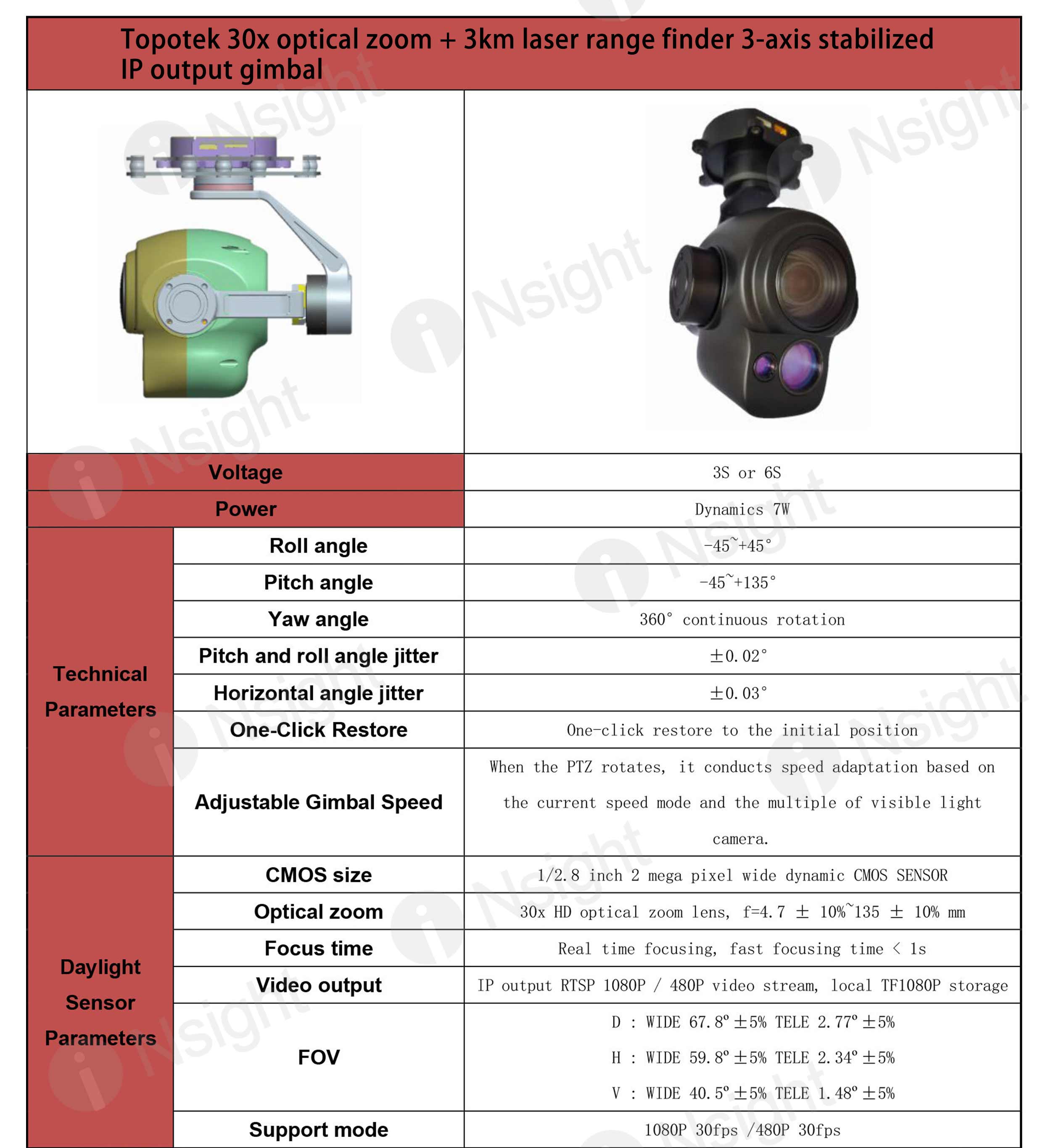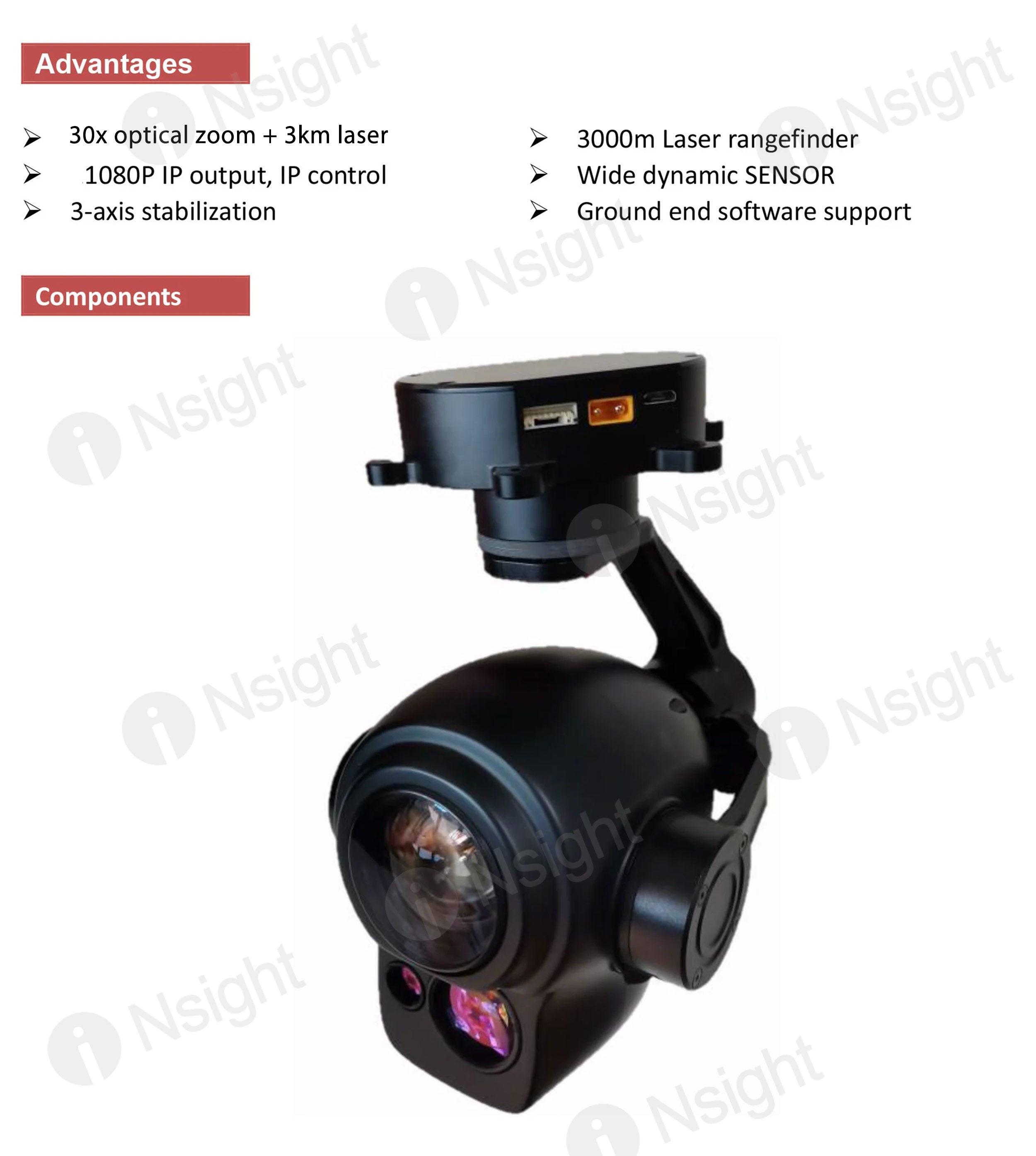 This Camera is a drone gimbal integrated with 30x optical zoom and 3000m laser rangfinder and 3-axis stabilized PTZ. Network output standard RTSP video stream, ground software support gimbal zoom and attitude control. PTZ adopts high-precision encoder FOC control scheme, which is characterized by high stability, small size, light weight and low power consumption. The camera adopts a wide dynamic SENSOR with 2 million effective pixel; Support 1080P local TF storage and network dual code stream transmission. The ranging data can be obtained in real time through network and serial port command.