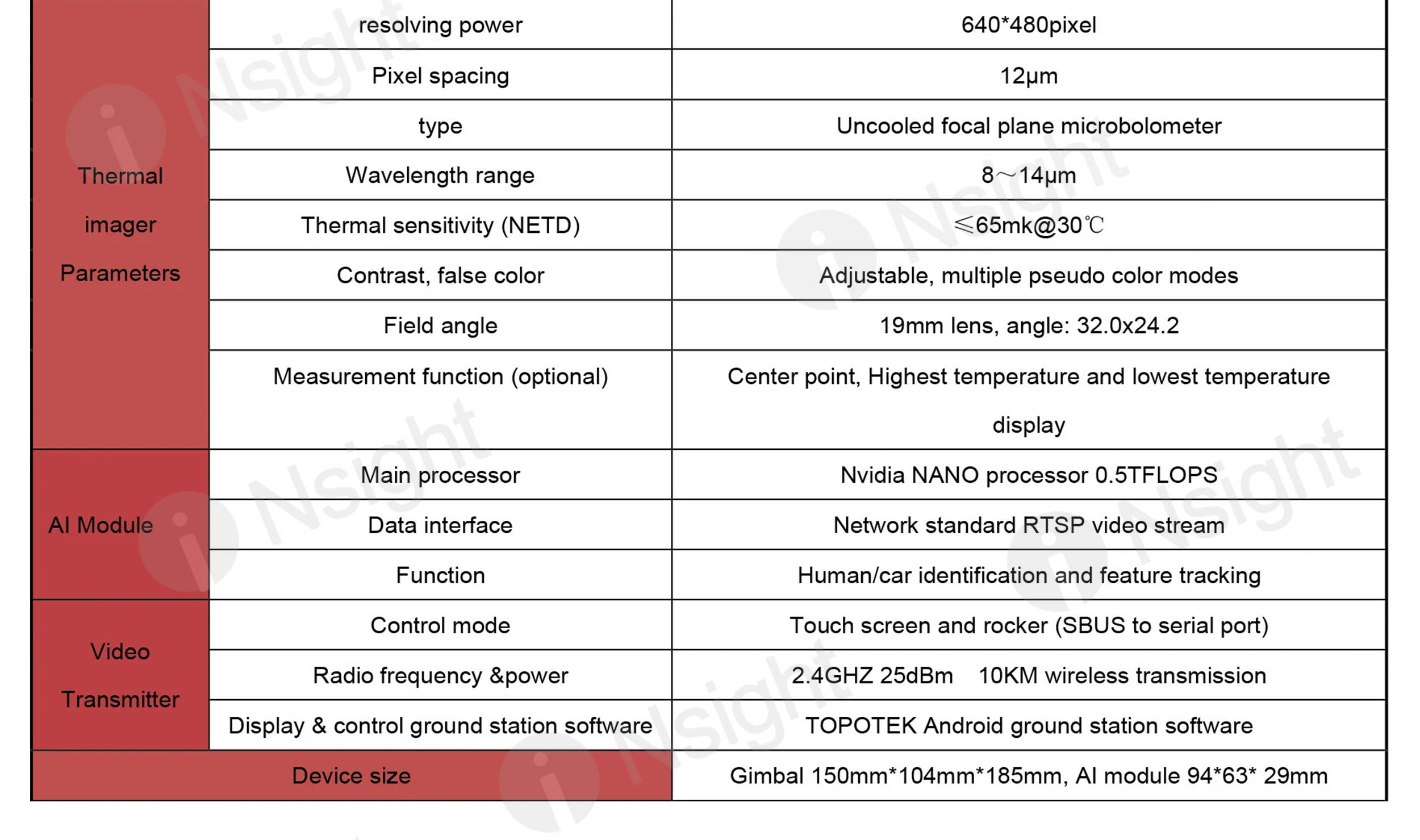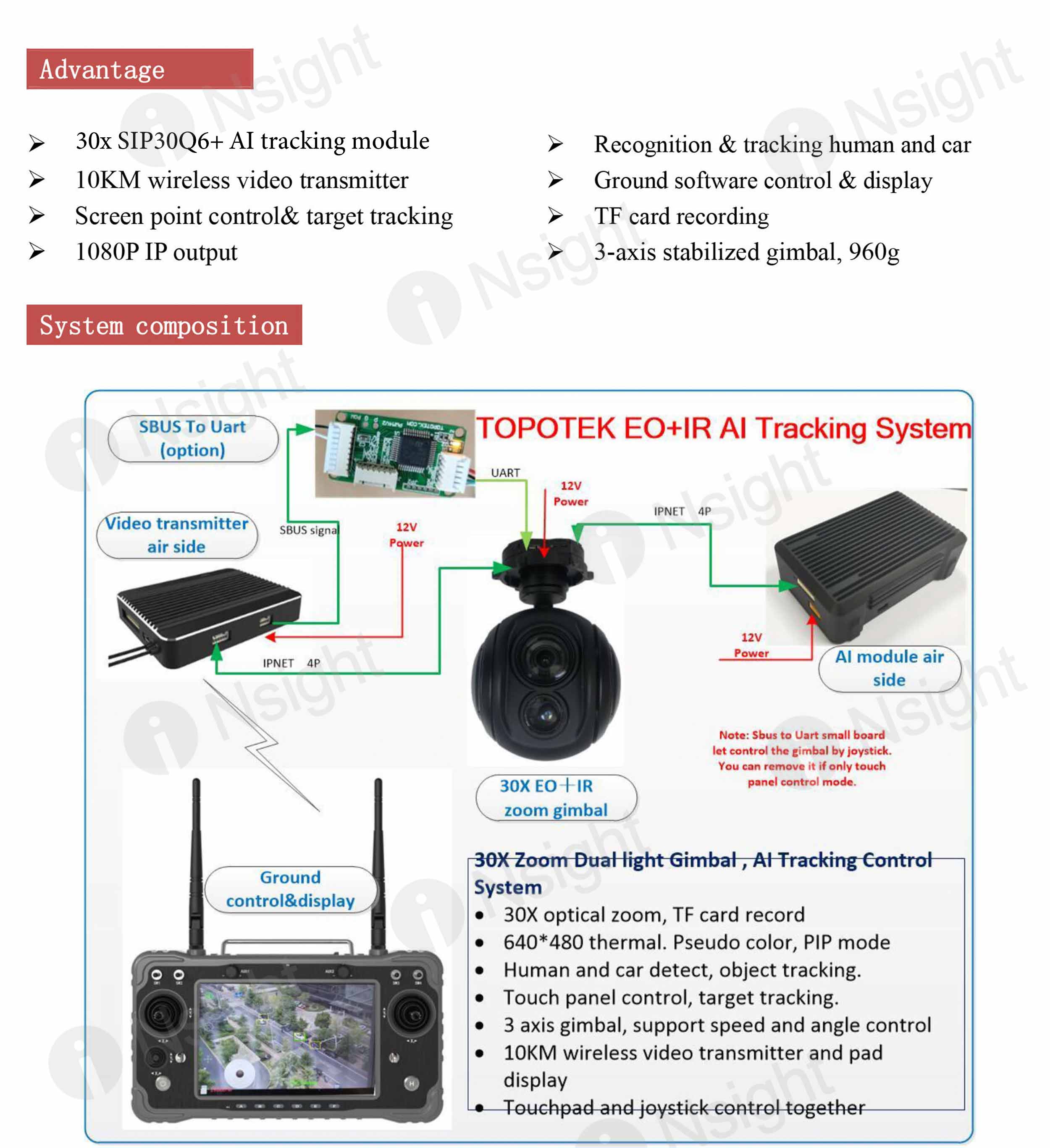 AIS30SQ6 is an integrated 30x optical zoom, 19mm 640*480 thermal camera, high-precision stabilization PTZ and image transmission integrated system. The PTZ adopts high-precision encoder FOC control scheme, integrated AI recognition module, and has human/car recognition, characteristic target tracking, integrated long-distance 10KM image transmission, ground display and control integrated PAD, built-in TOPOTEK ground station software. Visible light lens adopts 30x high-definition lens, thermal imaging adopts 19mm, upgrade thermal imager 640*480 resolution. This system supports: network dual stream output, local TF video and camera, ground station software control and real-time video display, optical zoom.