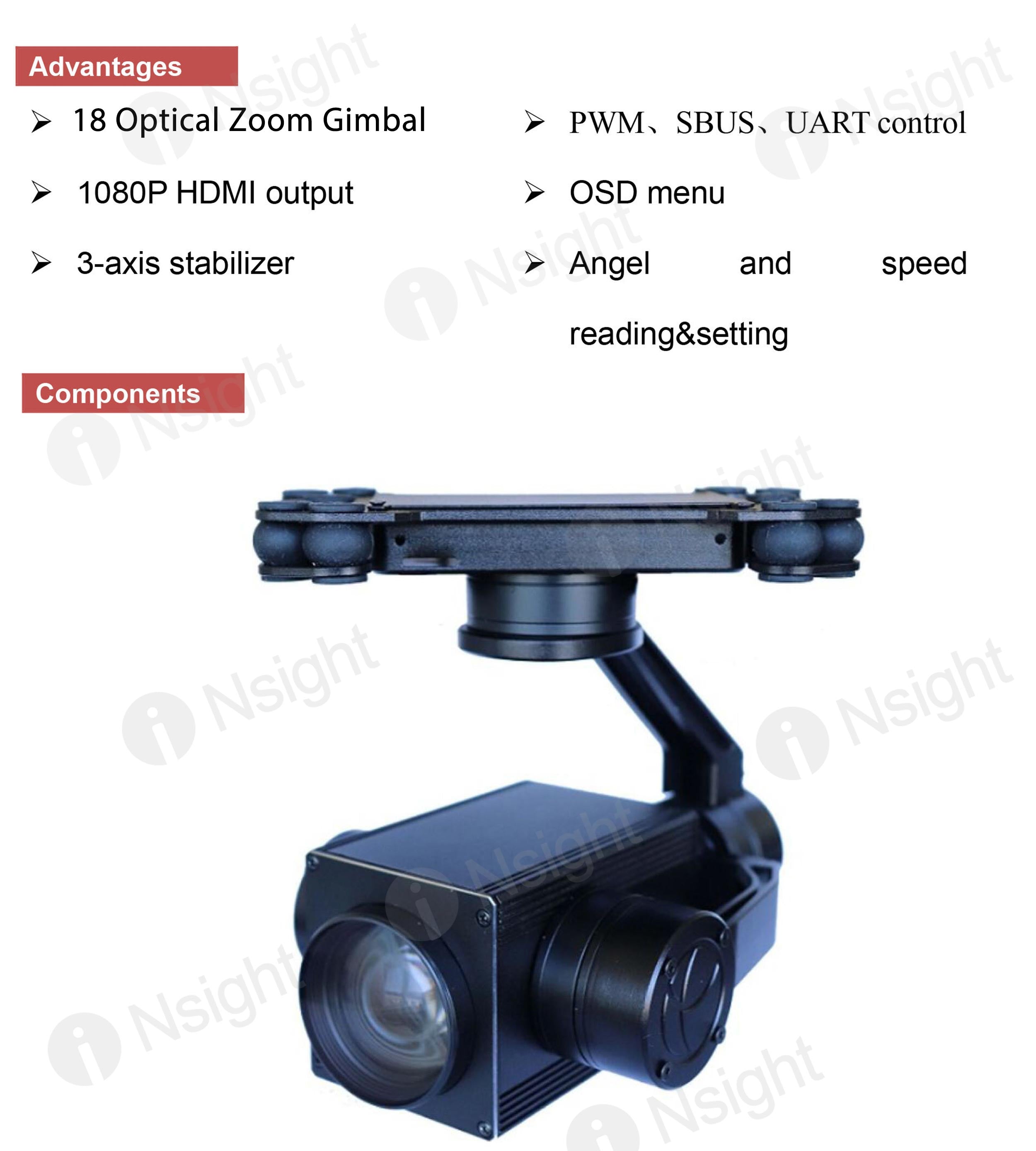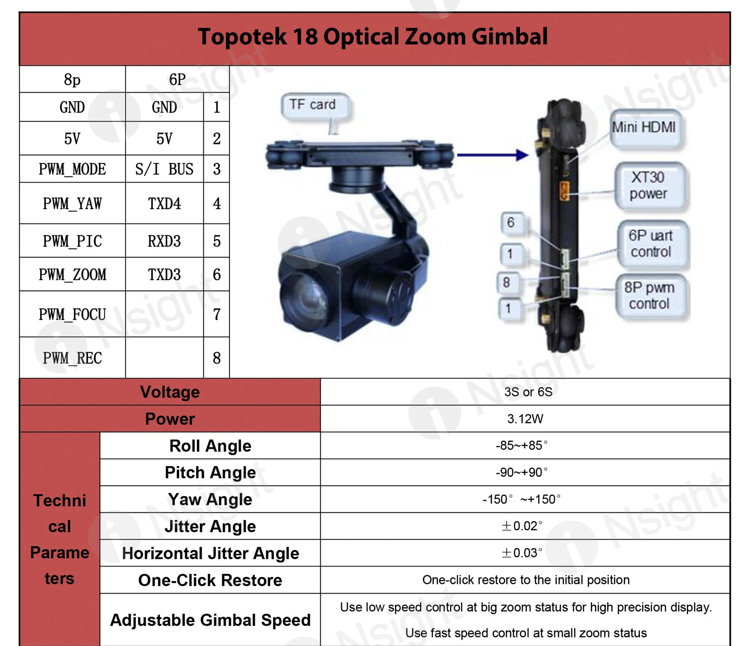 TP18 is a UAV load system which integrate the 18x optical zoom camera and 3-axis HDMI output gimbal. The MINI HDMI interface outputs 1080P 60FPS high-definition video, supports gimbal control and zoom camera control. The gimbal uses a high-precision encoder FOC control scheme, which has the characteristics of high stability, small size, light weight and low power consumption. The camera uses a low-illumination sensor with an effective pixel of 4 million; supports 1080P local TF storage. Built-in camera core TOP-3082.