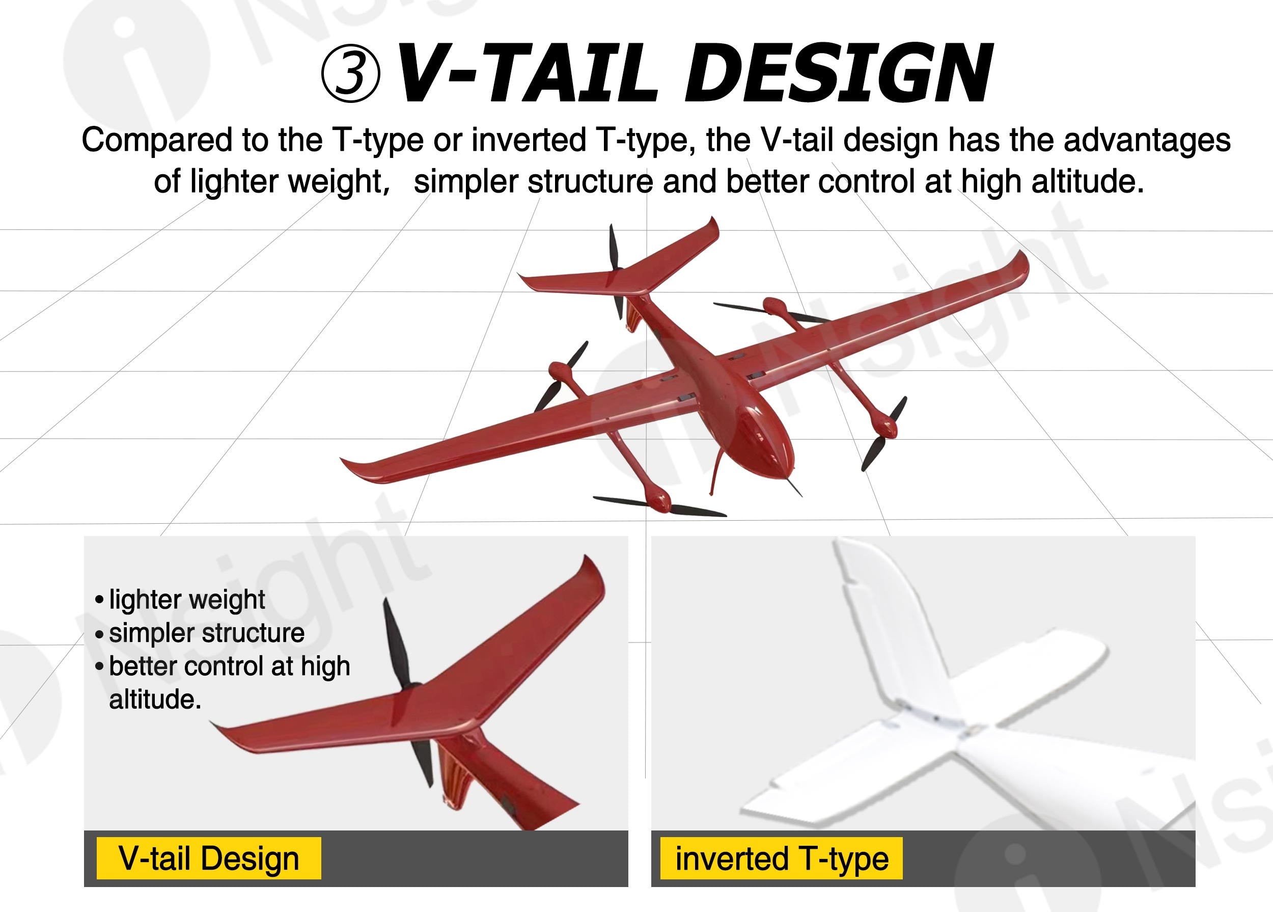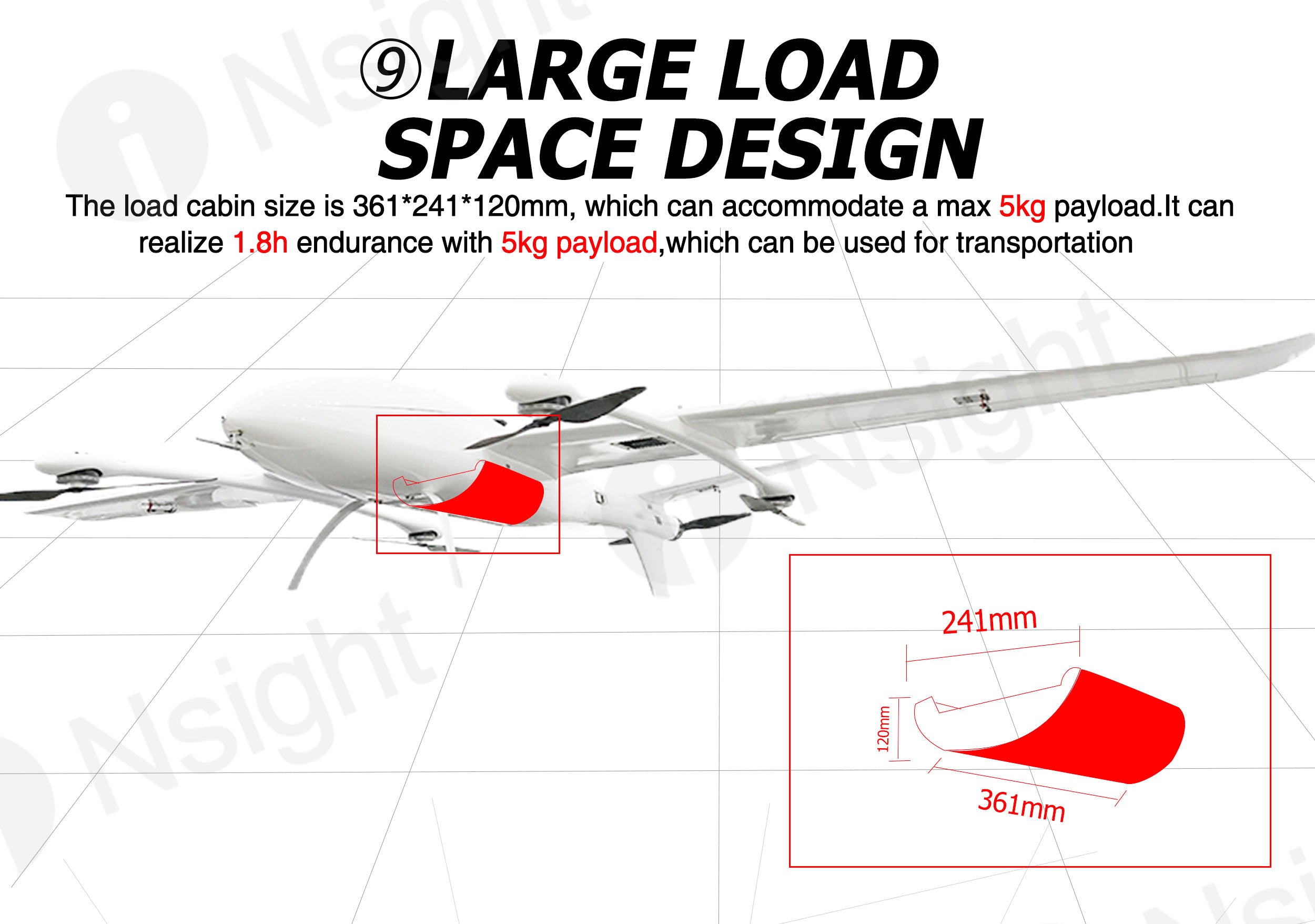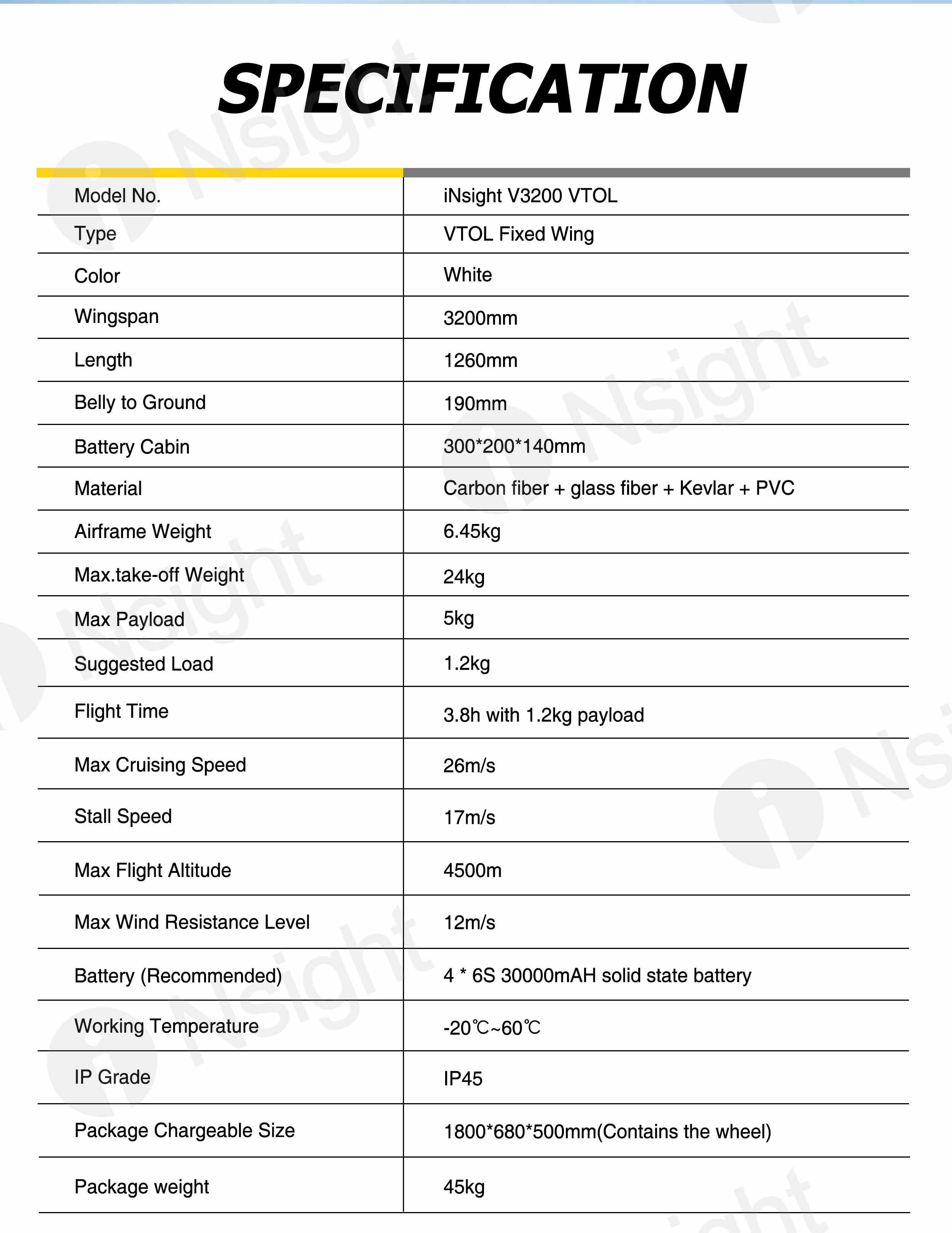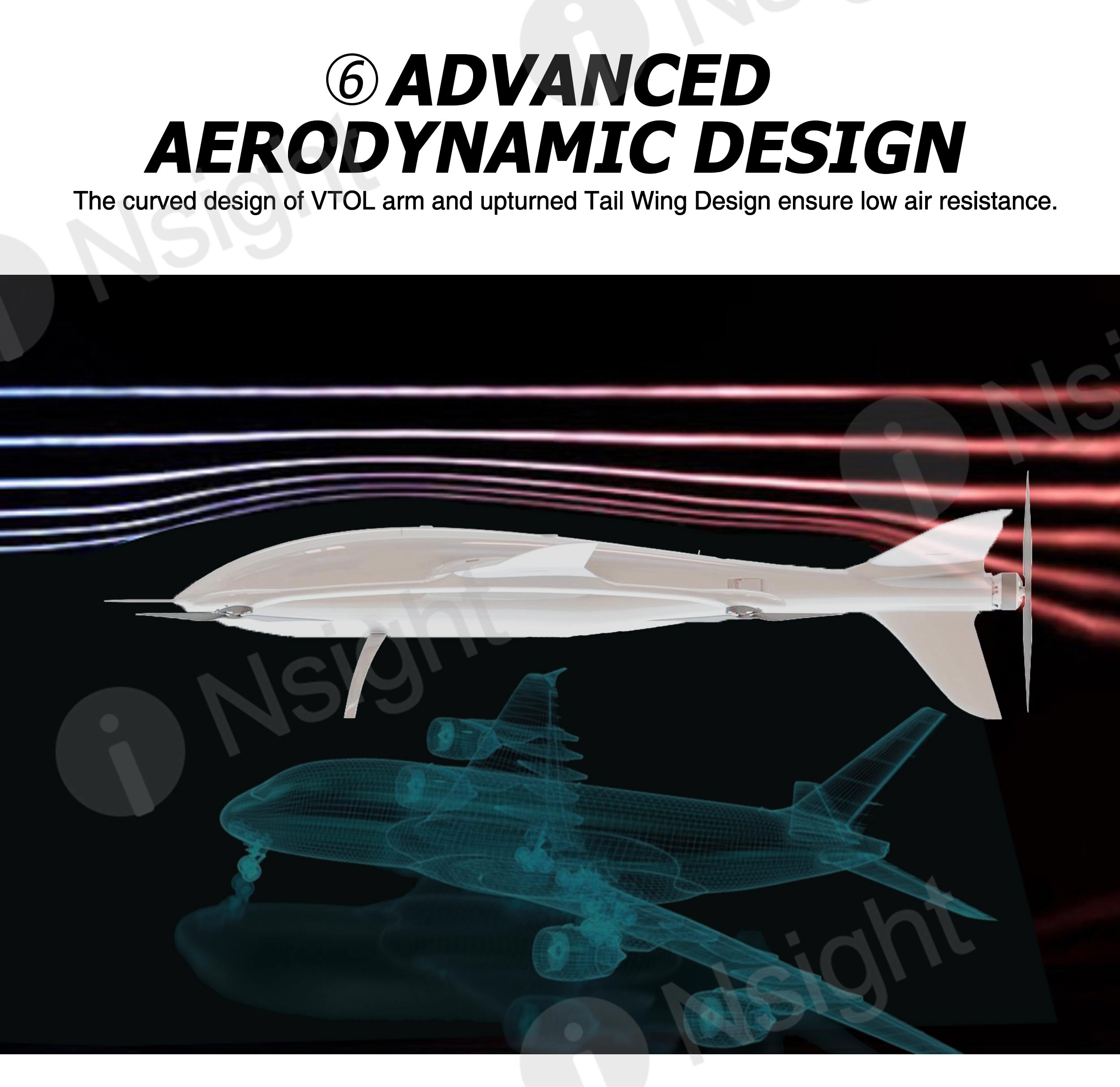 The fuselage of iNsight 3200 VTOL is made of composite materials (carbon fiber + fiberglass + Kevlar + PVC), which are very light and durable.