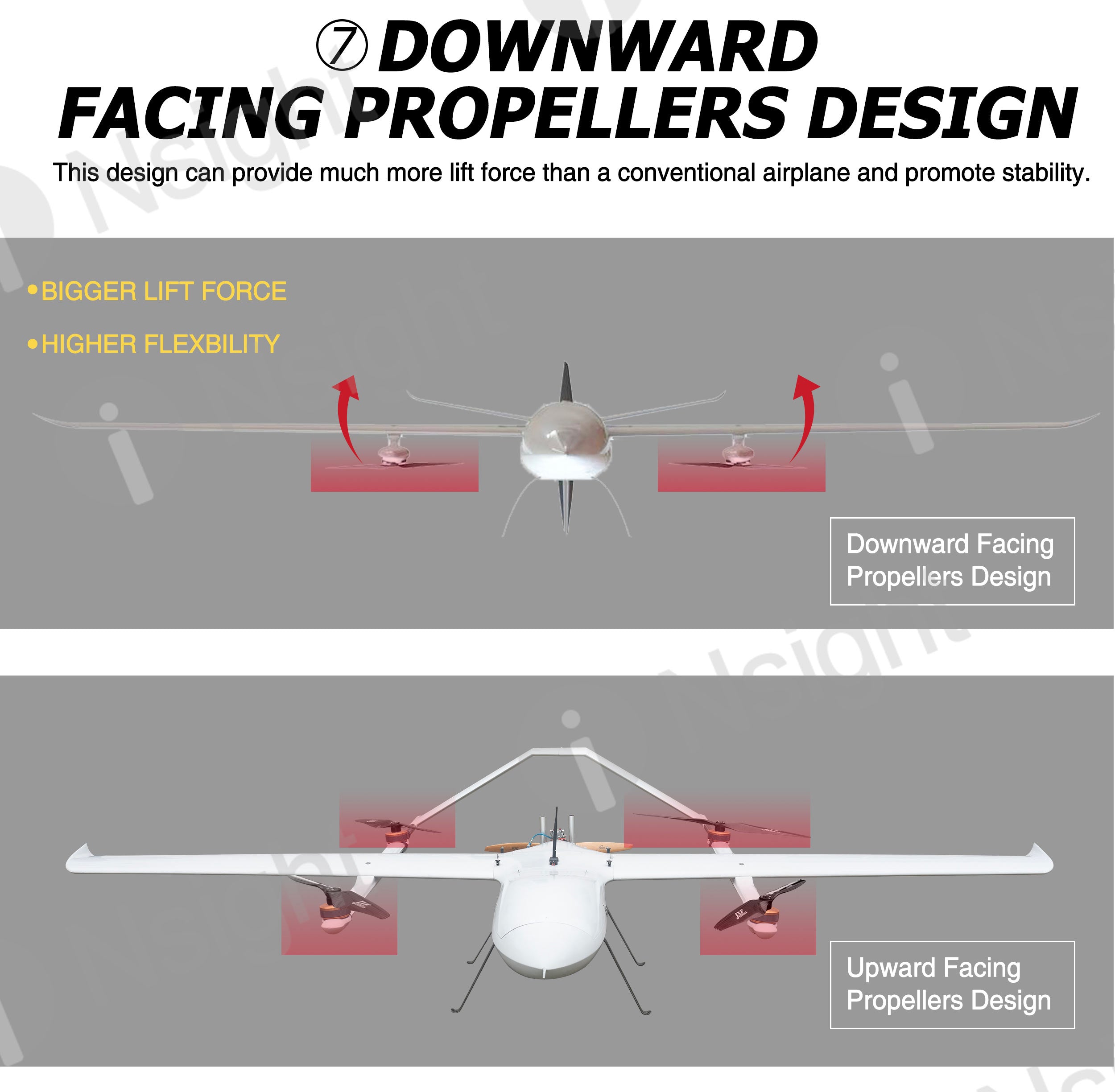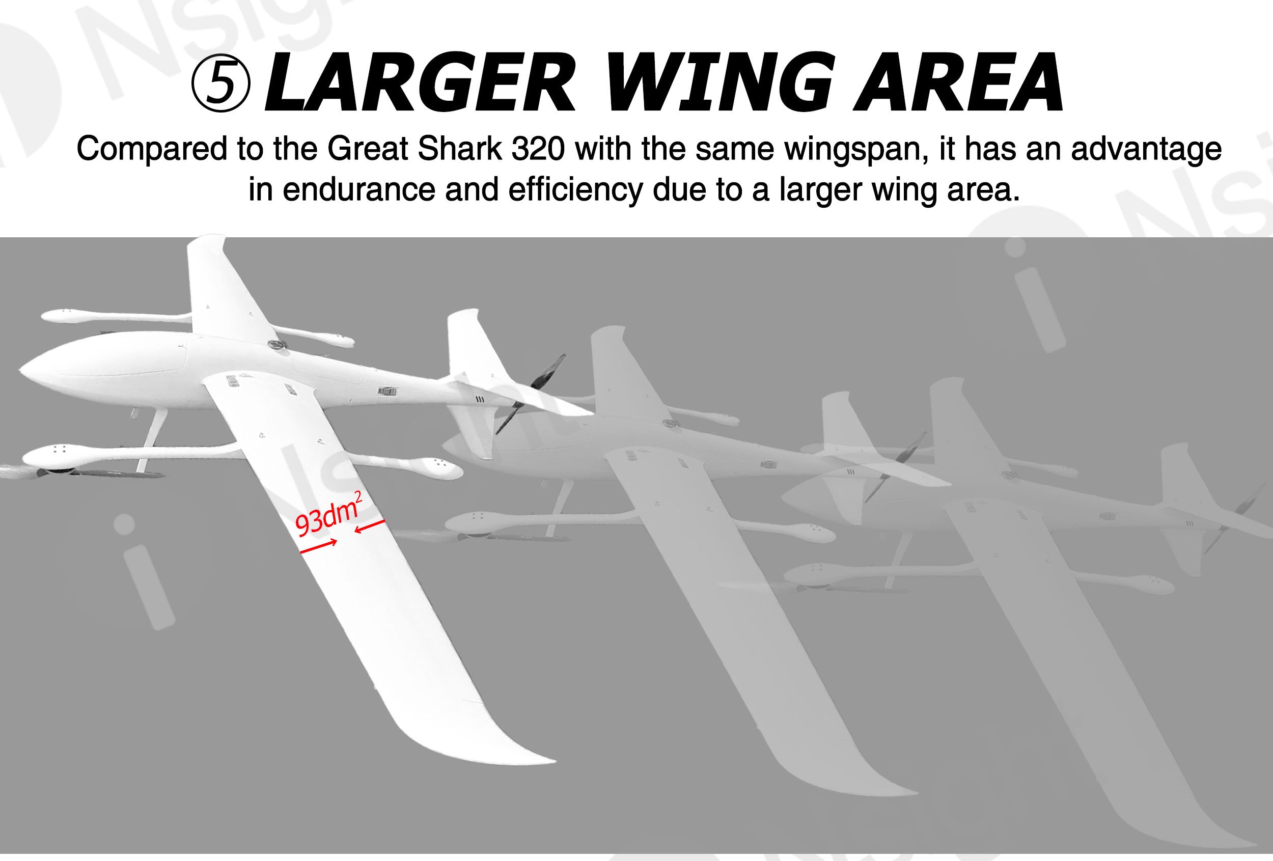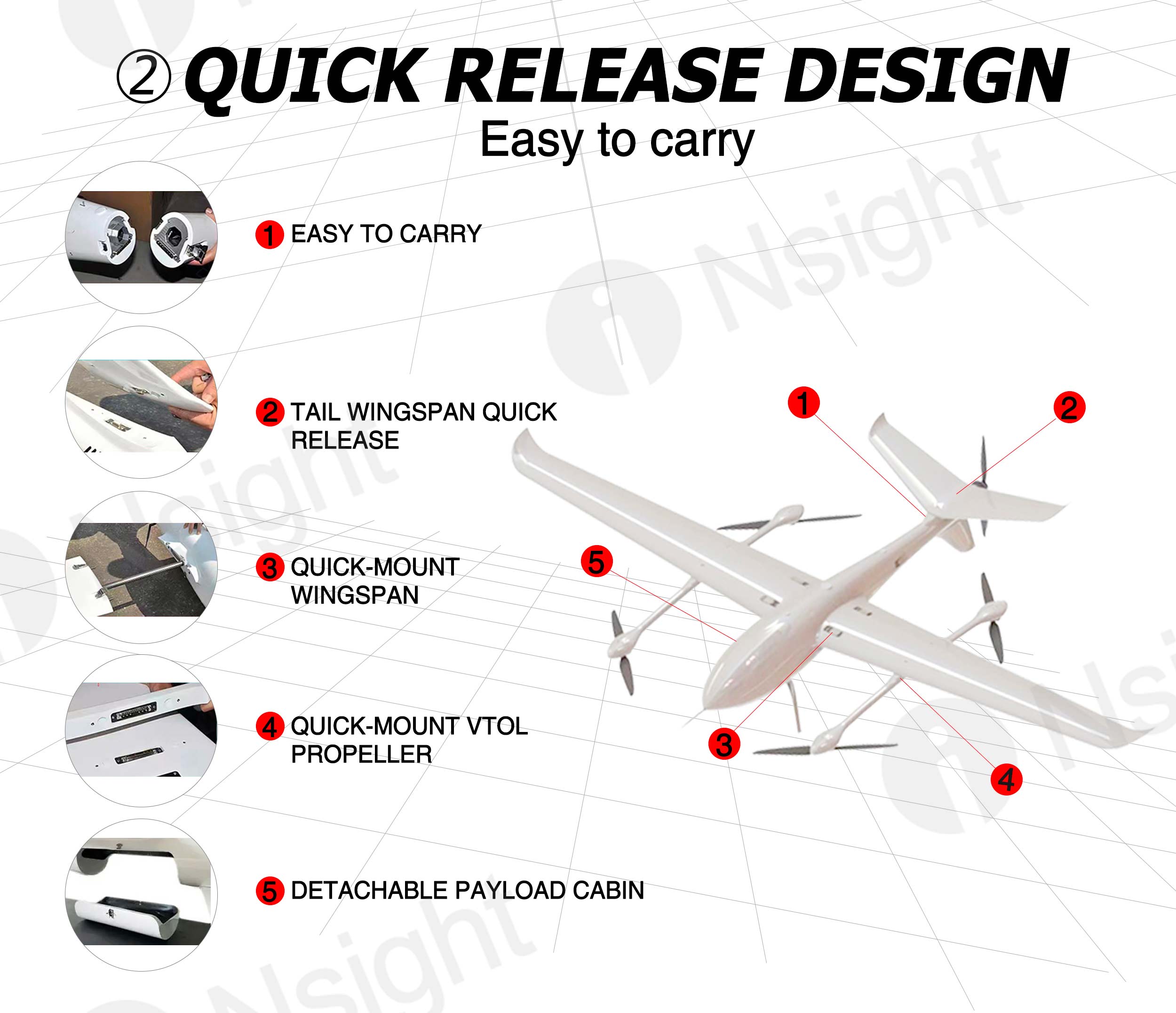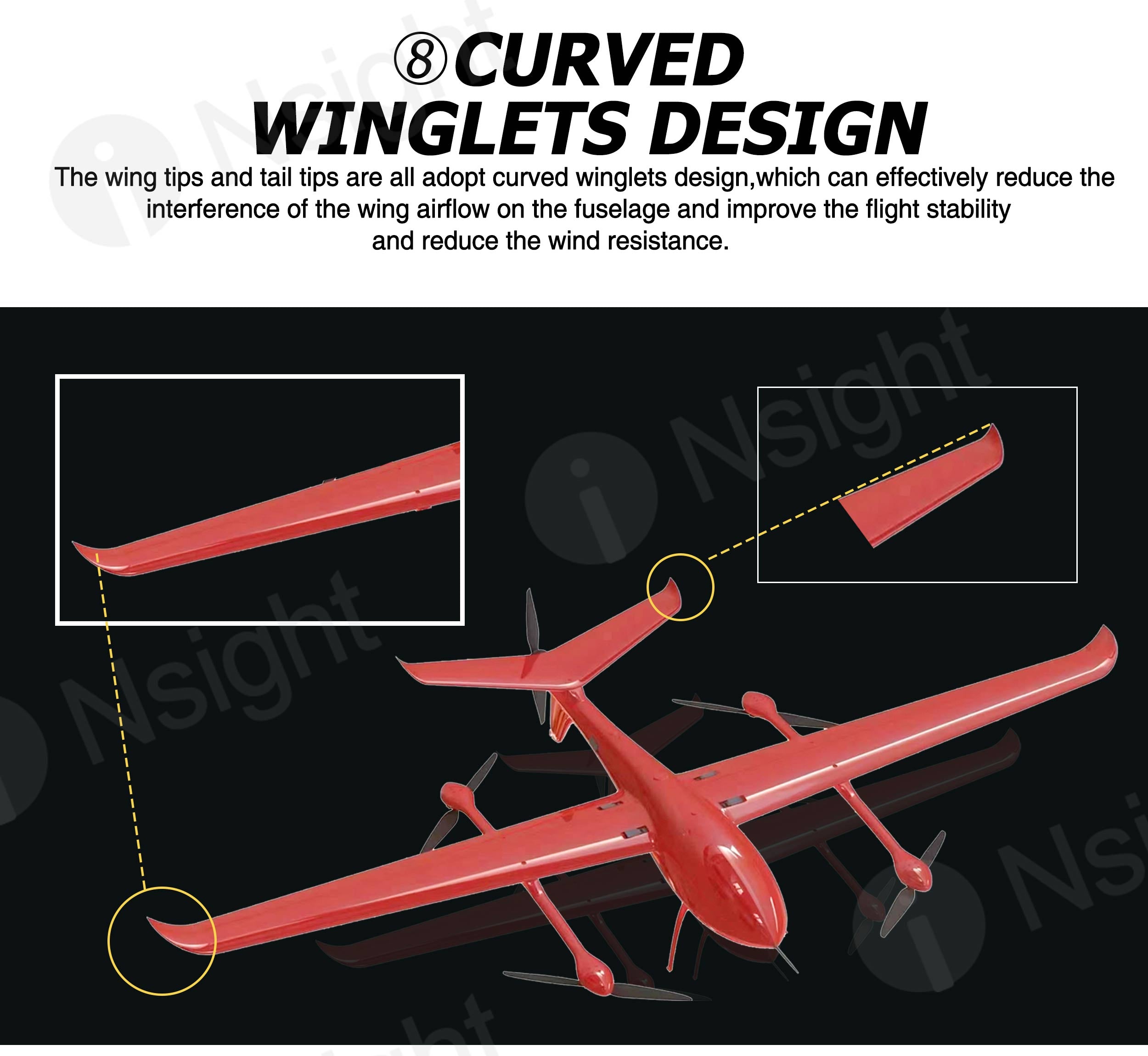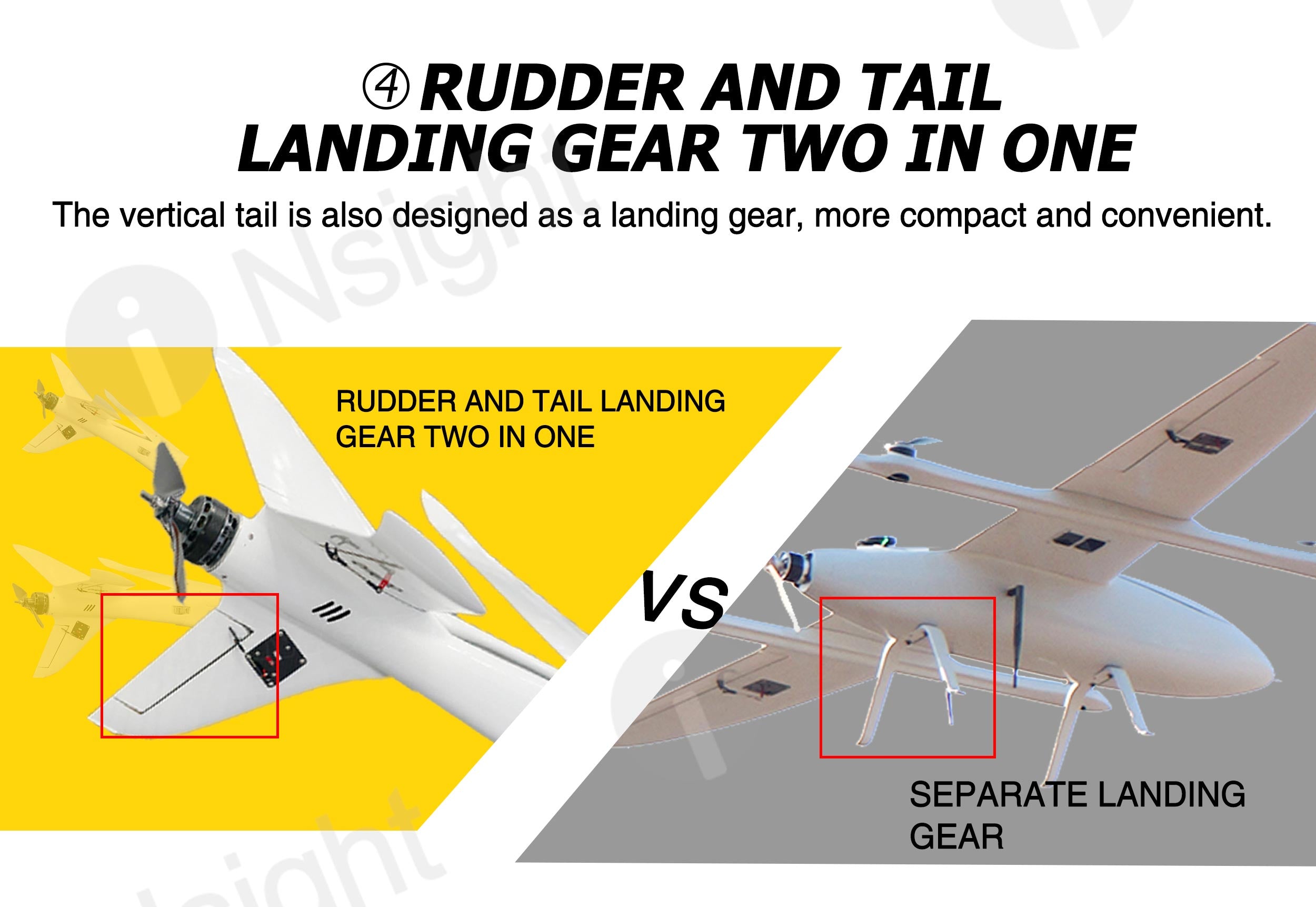 The fuselage of iNsight 3200 VTOL is made of composite materials (carbon fiber + fiberglass + Kevlar + PVC), which are very light and durable.