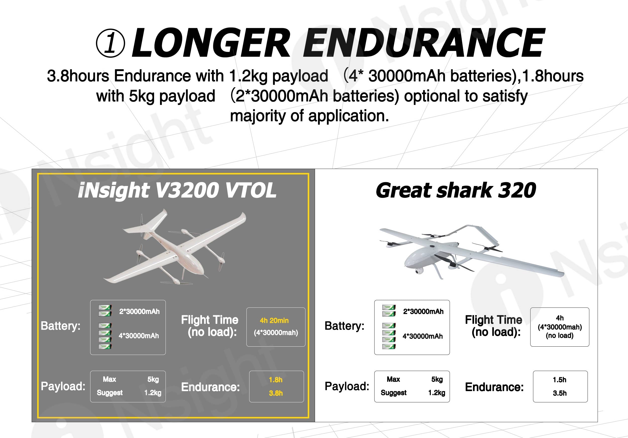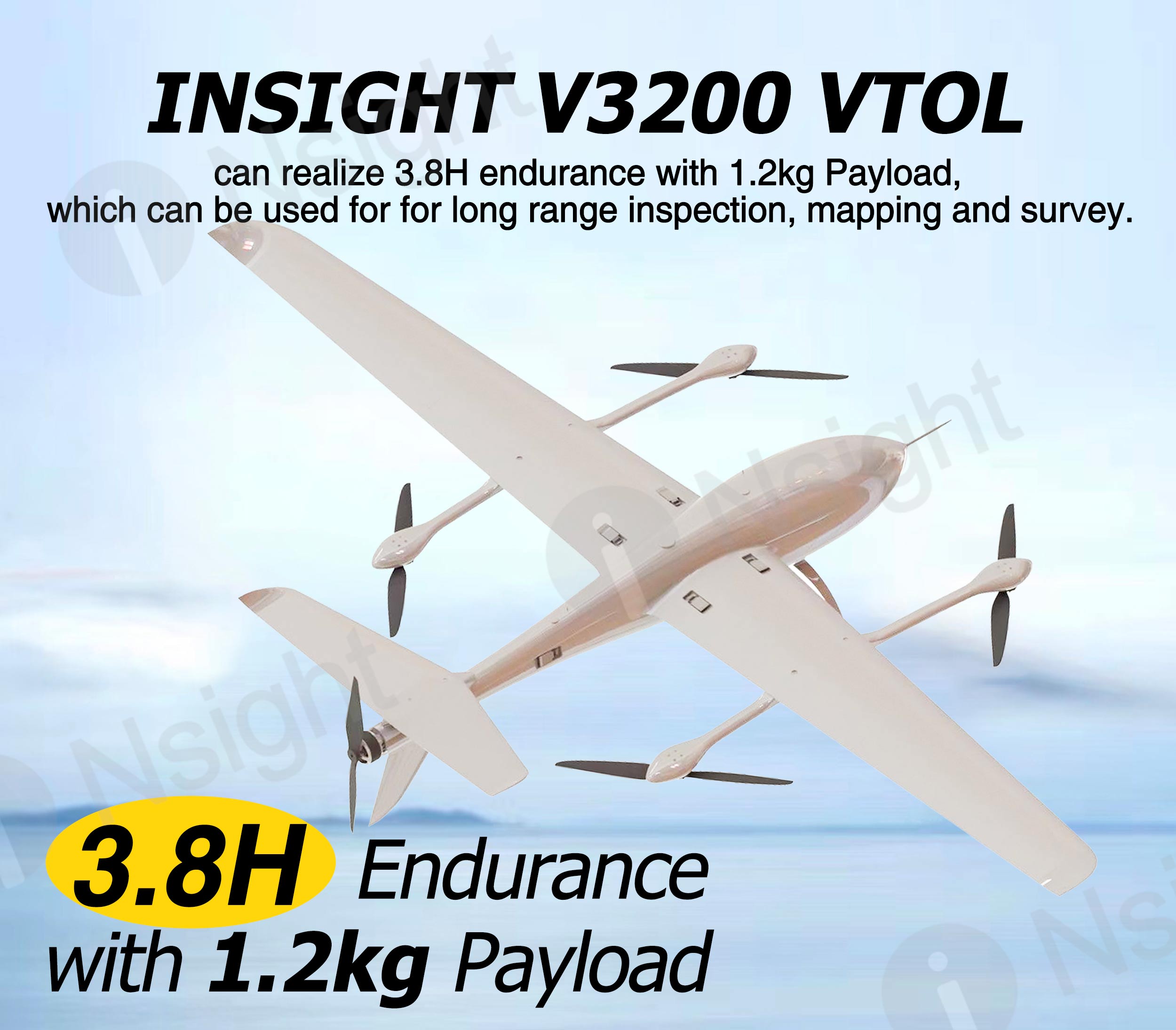 iNsight V3200 VTOL can realize 3.8H endurance with 1.2kg Payload, which can be used for for long range inspection, mapping and survey.