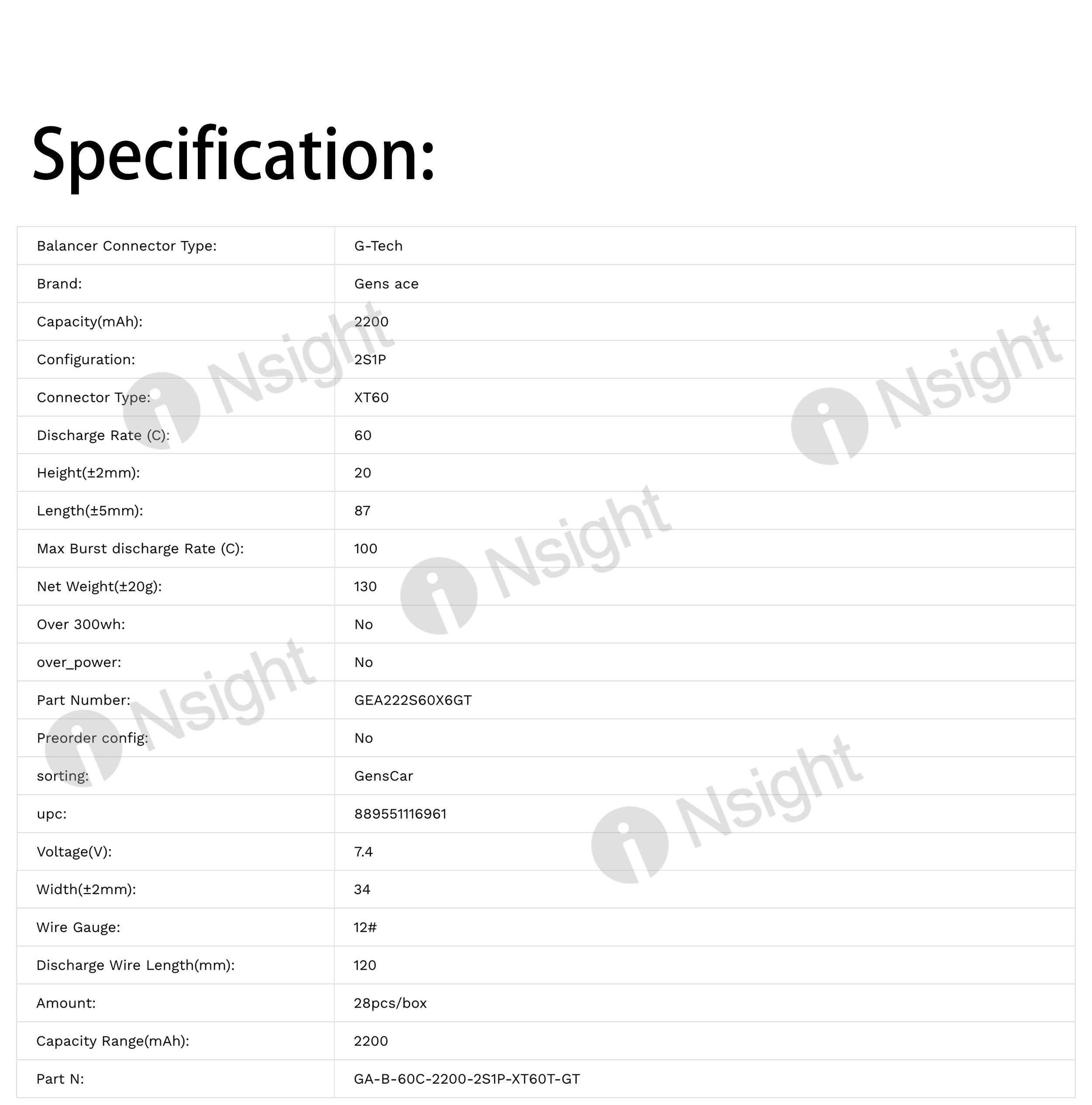 Gens Ace G-Tech 60C 2S1P 7.4V 2200mah Lipo Battery Pack With XT60 Plug