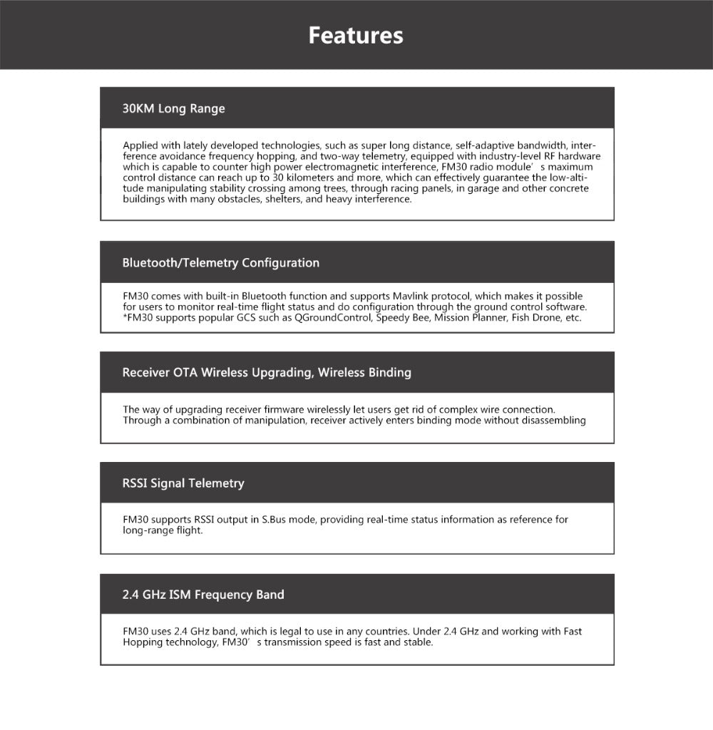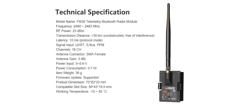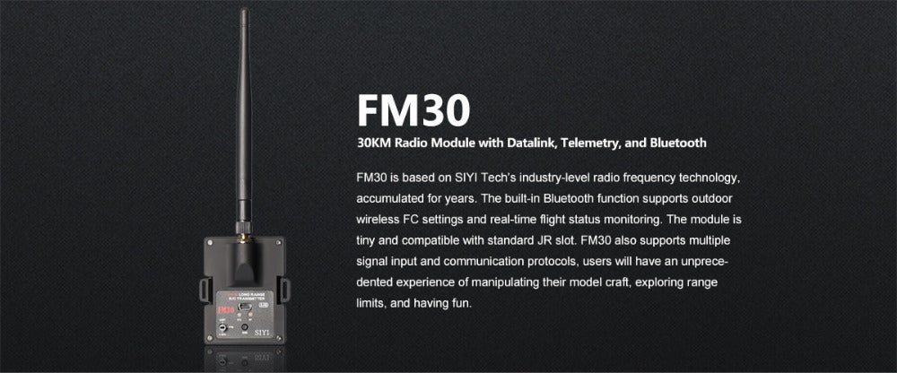 FM30 is based on SIYI Tech's industry-level radio frequency technology, accumulated for years. The built-in Bluetooth function supports outdoor wireless FC settings and real-time flight status monitoring. The module is tiny and compatible with standard JR slot. FM30 also supports multiple signal input and communication protocols,users will have an unprece-dented experience of manipulating their model craft,exploring range limits, and having fun.