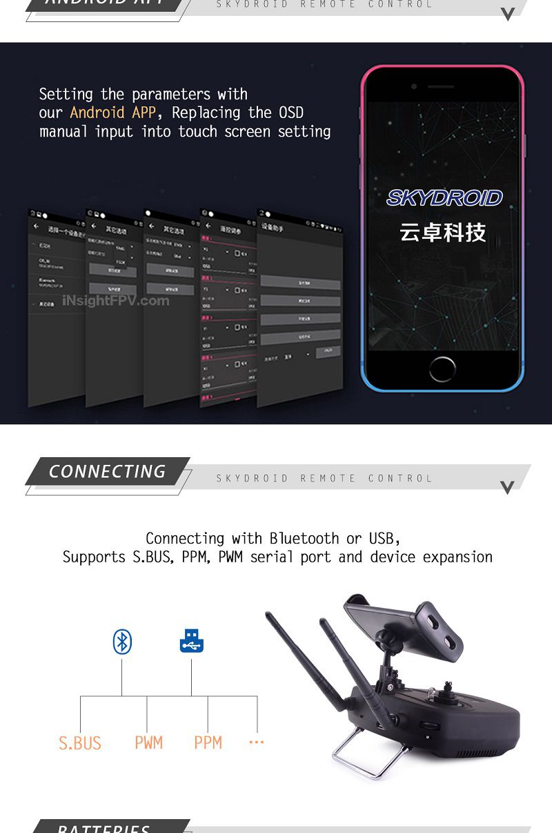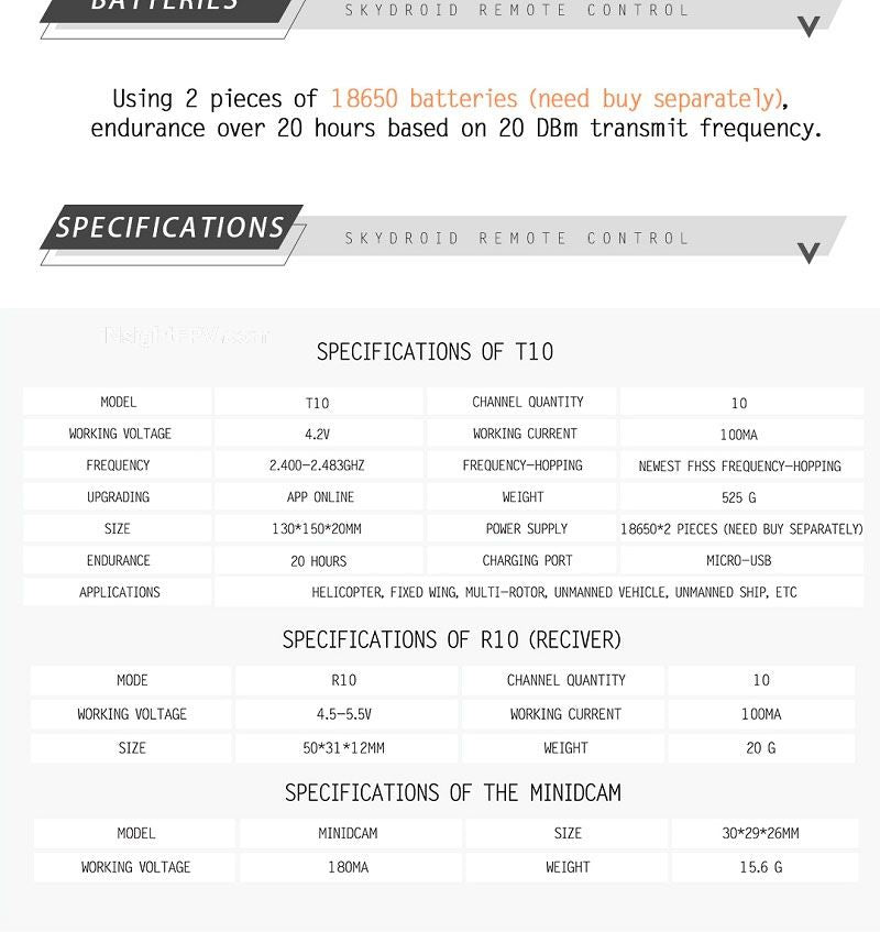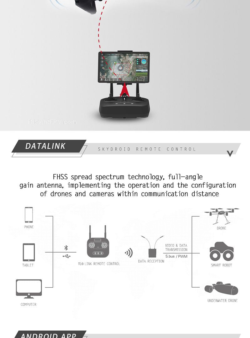 Skydroid T10 is great for UAV agriculture drones, helicopters, fixed wing, multi-rotor and other industrial applications. Skydroid T10 remote controller is highly integrated with data transmission, video transmission and telemetry. With LORA technology and redundant algorithm to achieve more than 10km long video transmission distance based on 2.4GHz and 100mW transmit power consumption.