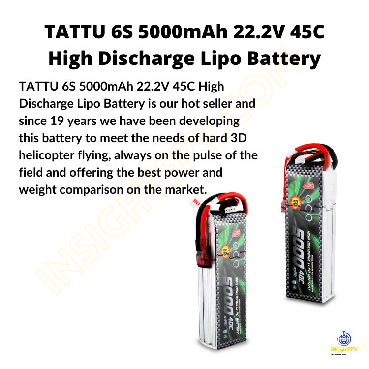 TATTU 6S 5000mAh 22.2V 45C High Discharge Lipo Battery is our hot seller and since 19 years we have been developing this battery to meet the needs of hard 3D helicopter flying, always on the pulse of the field and offering the best power and weight comparison on the market. If you want 3D flight, this is the battery you want to choose. It is also the best choice for large sport aerobatic and EDF aircraft if you want high voltage recovery and stability.
