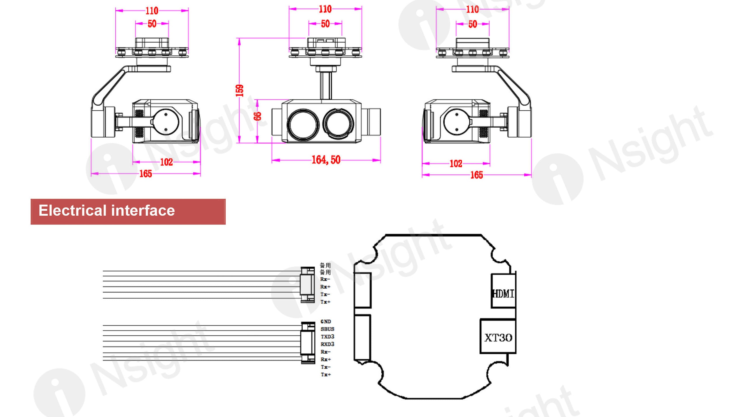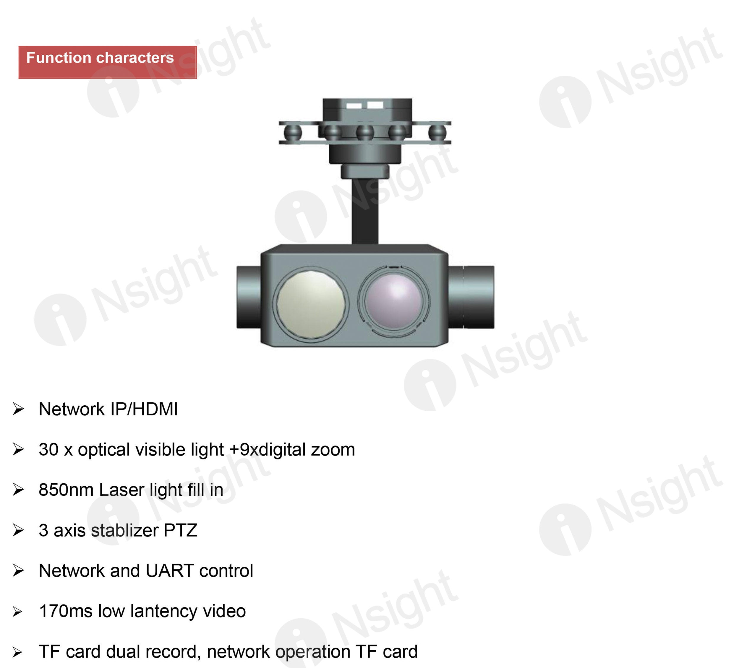 High-precision professional 3-axis stablizer PTZ dual light integrated system,IP/HDMI dual output, the PTZ adopted high precision encode FOC control scheme.It has the characteristics of high quality, small size, light weight and low power consumption.The visible light camera adopts a wide dynamic SENSOR with an effective 2 mega pixels. The laser fill light adopts 850nm surface laser. The system supports network RTSP stream output. Serial port and network can synchronously control camera and PTZ, support local TF storage. Full metal housing.