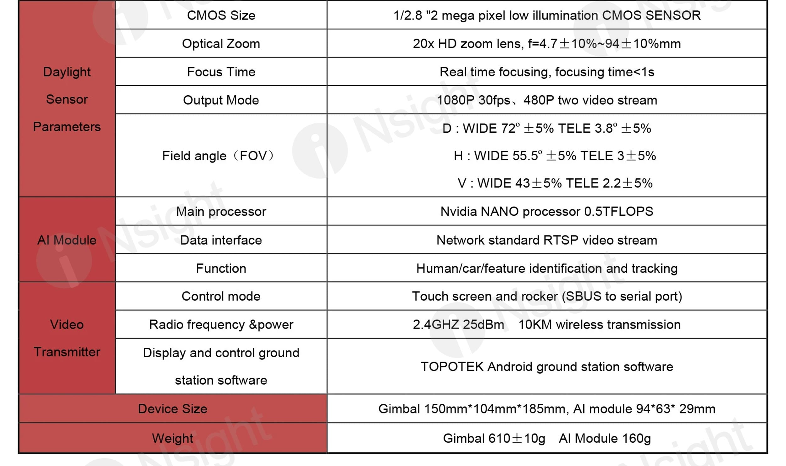 AIS20S90 is an integrated 20x optical zoom, high-precision stabilization gimbal and image transmission integrated system. The PTZ adopts high-precision encoder FOC control scheme, integrated AI recognition module, and has human and vehicle Pattern recognition, characteristic target tracking, integrated long-distance 10KM image transmission and ground display and control integrated PAD, built-in TOPOTEK ground station software. SENSOR has 2 million effective pixels, AIS20S90 has wide dynamic function. This system supports: network dual stream output, local TF video recording and photographing, ground station software control and real-time video display, optical zoom.