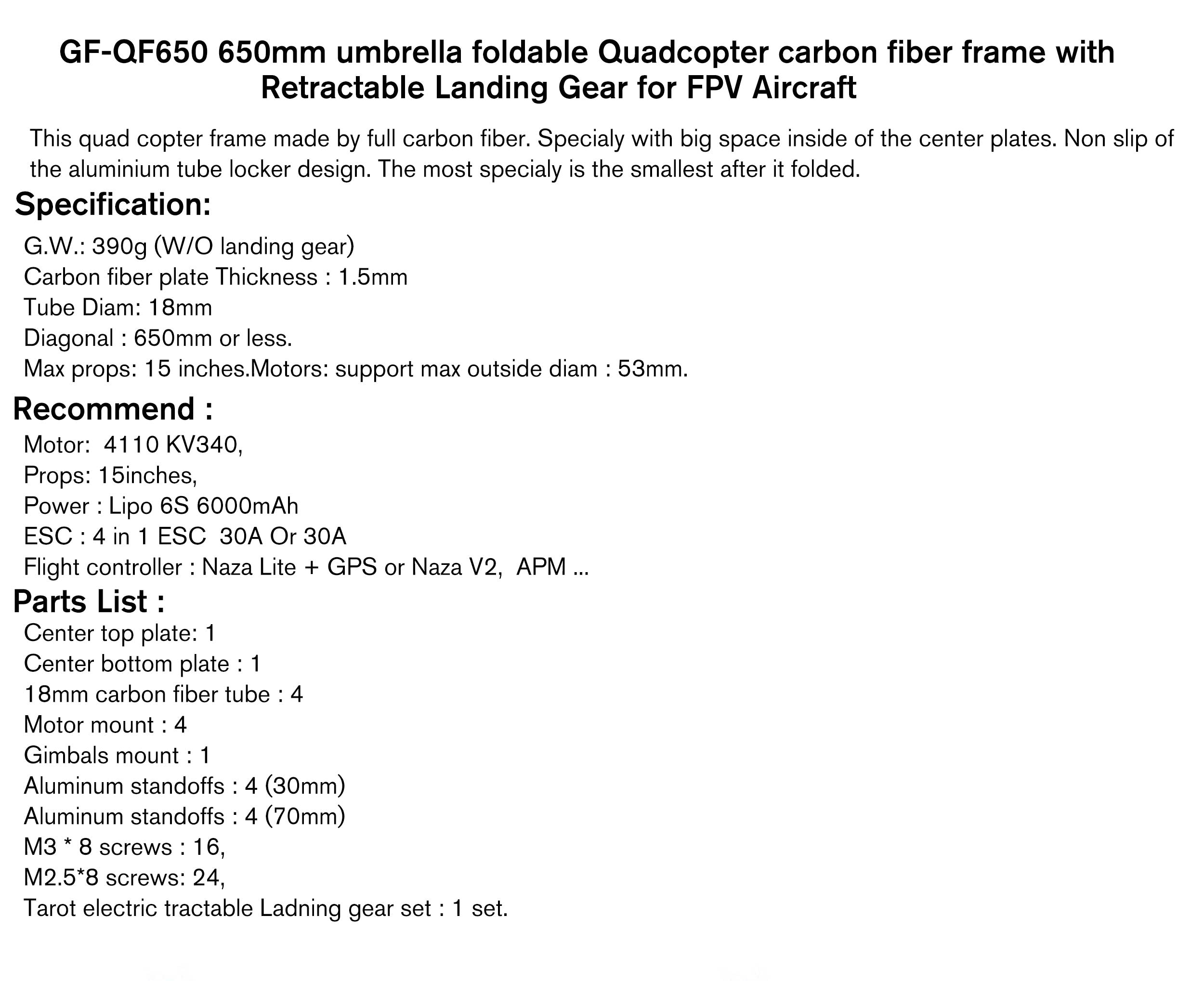 GF-QF650 650mm umbrella foldable Quadcopter carbon fiber frame with Retractable Landing Gear for FPV Aircraft