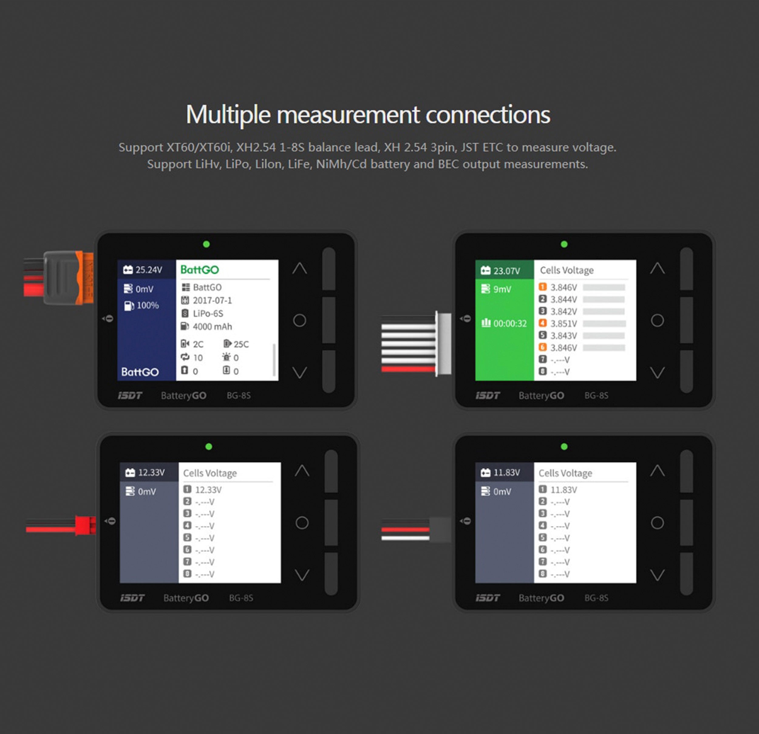 ✔✔【Multiple measurement connections】: Support XT60 / XT60i, XH2.54 1-8S balance lead, XH 2.54 3pin, JST ETC to measure voltage. Support LiHv, LiPo, Lilon, LiFe, NiMh / Cd battery and BEC output measurements.