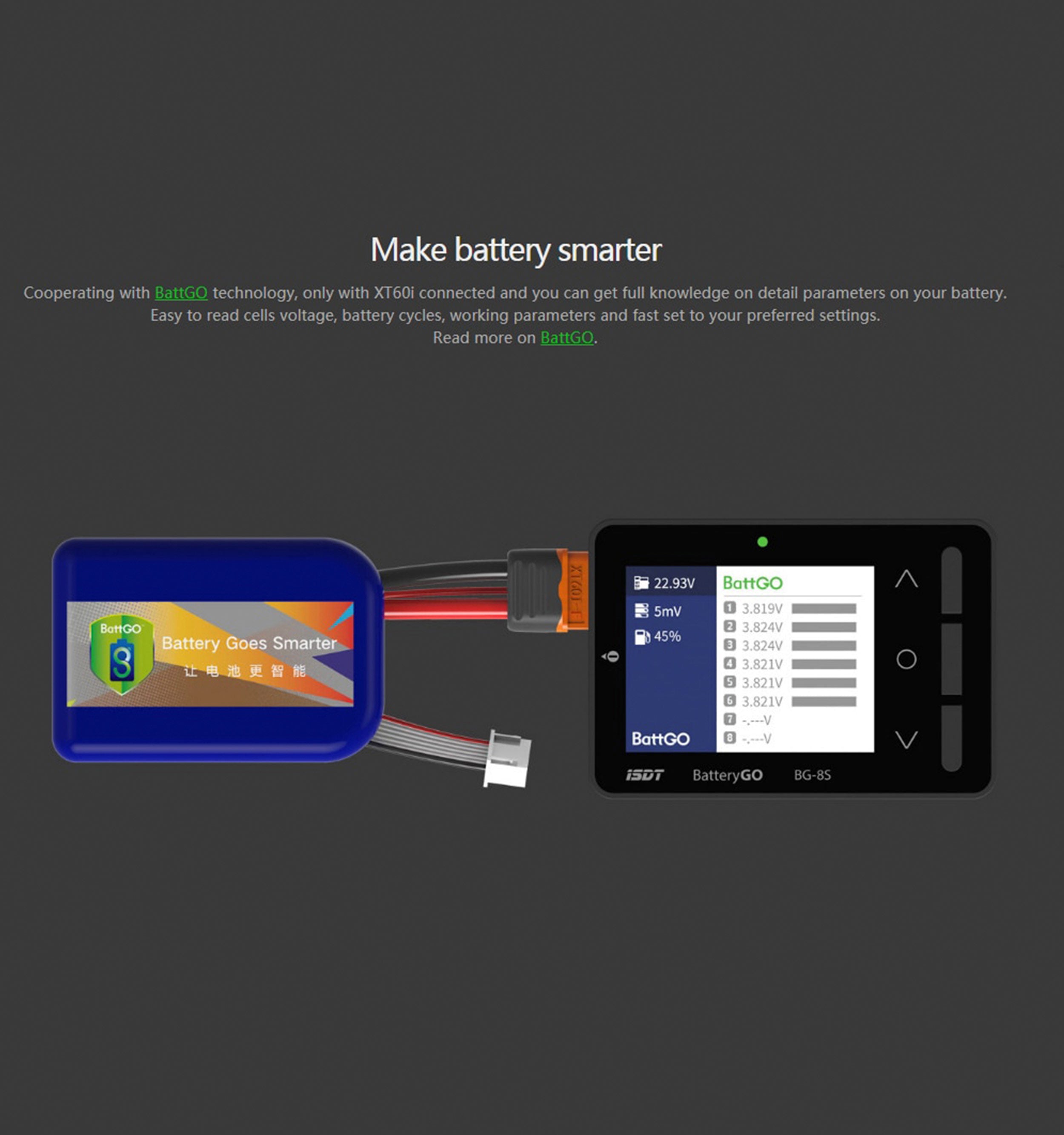 ✔✔【Make the battery smarter】: Working together with BattGO technology, only with XT60i connected, you can get full information about the detail parameters of your battery. Easy to read cell voltage, battery cycles, working parameters and quick adjustment to your preferred settings.
