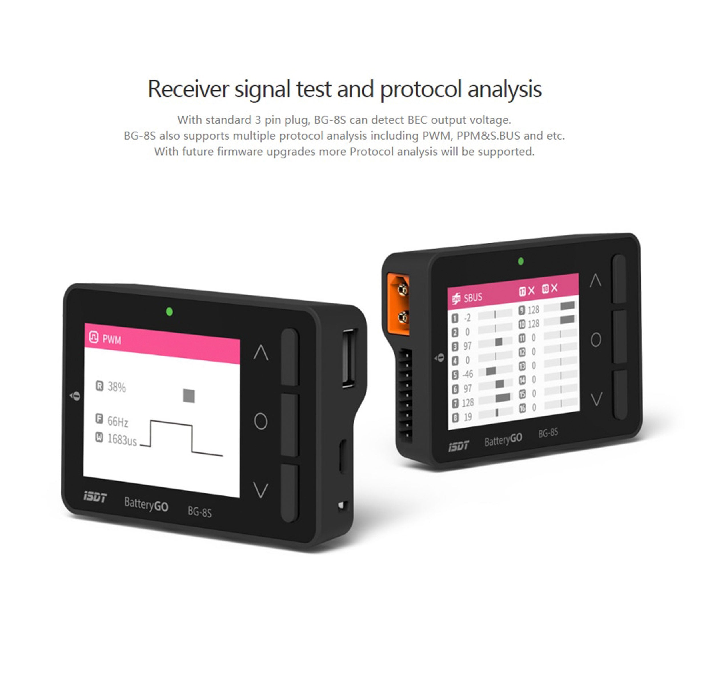 ✔✔【Receiver Signal Test and Protocol Analysis】: With a standard 3-pin connector, the BG-8S can detect the BEC output voltage. BG-8S also supports multi-protocol analysis including PWM, PPM & S.BUS etc. More protocol analysis will be supported with future firmware updates.