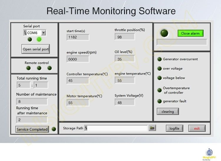 Halo-2000 adopts electrical starting method, which can be started through PWM or CAN-BUS, quick and convenient, and the generator can be restarted quickly after flameout in the air; and a Monitoring Software is provided to monitoring the generator working status in real time. The design of protects for over voltage, over currency, over temperature, under voltage and short circuit, substantially improves its safety. Halo-2000 generator is very light, only 4.5kg. The continuous output power is 1800w and the output voltage is 48V. Besides this, a 12S lipo battery package is needed to be installed onboard to offer emergency back-up power for quick climbing and quick maneuvering.