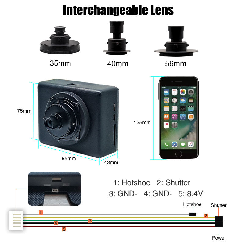Note: The camera lens is interchangeable, you can change the camera lens such as 35mm, 40mm and 56mm according to your shooting needs.