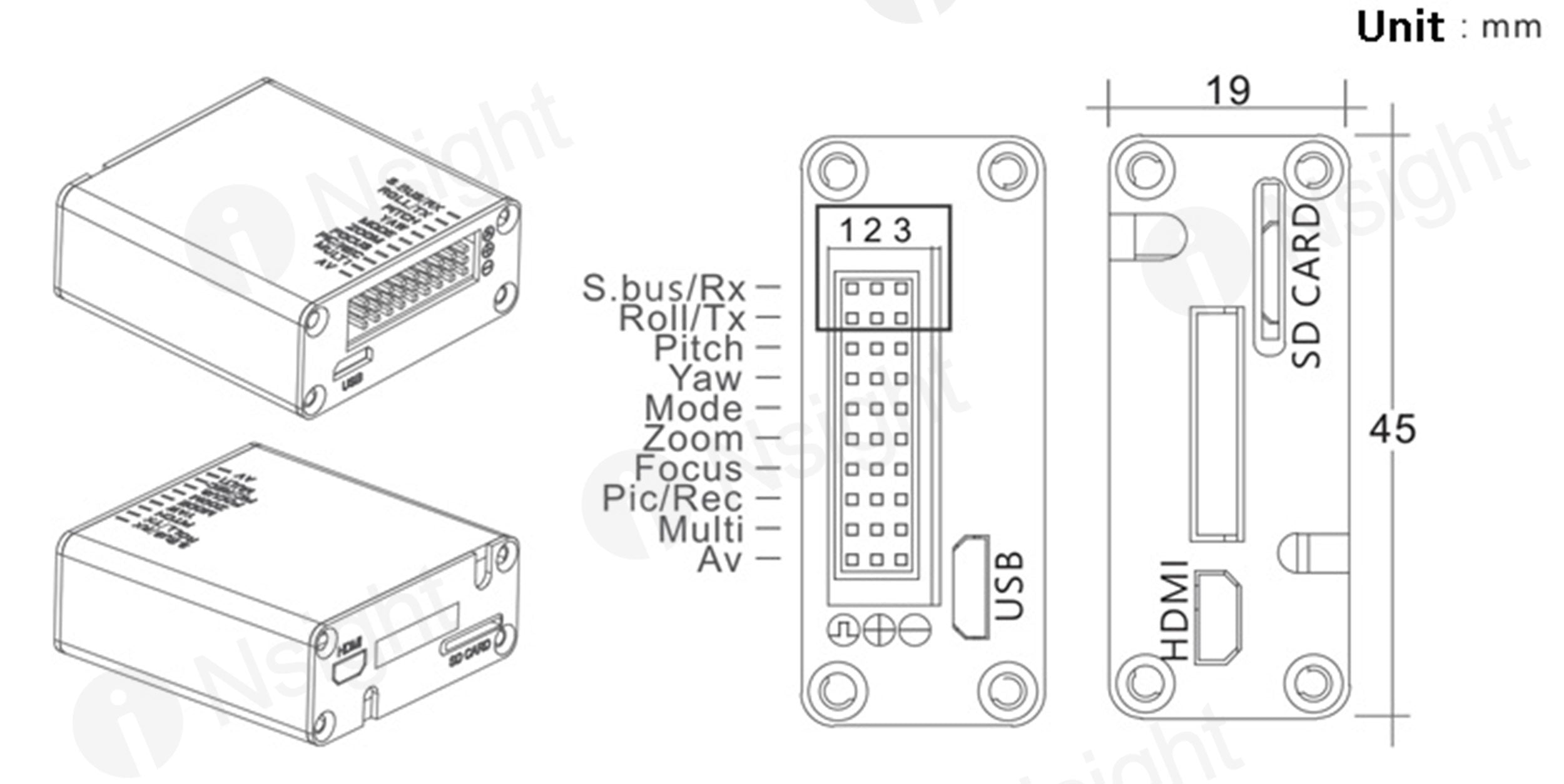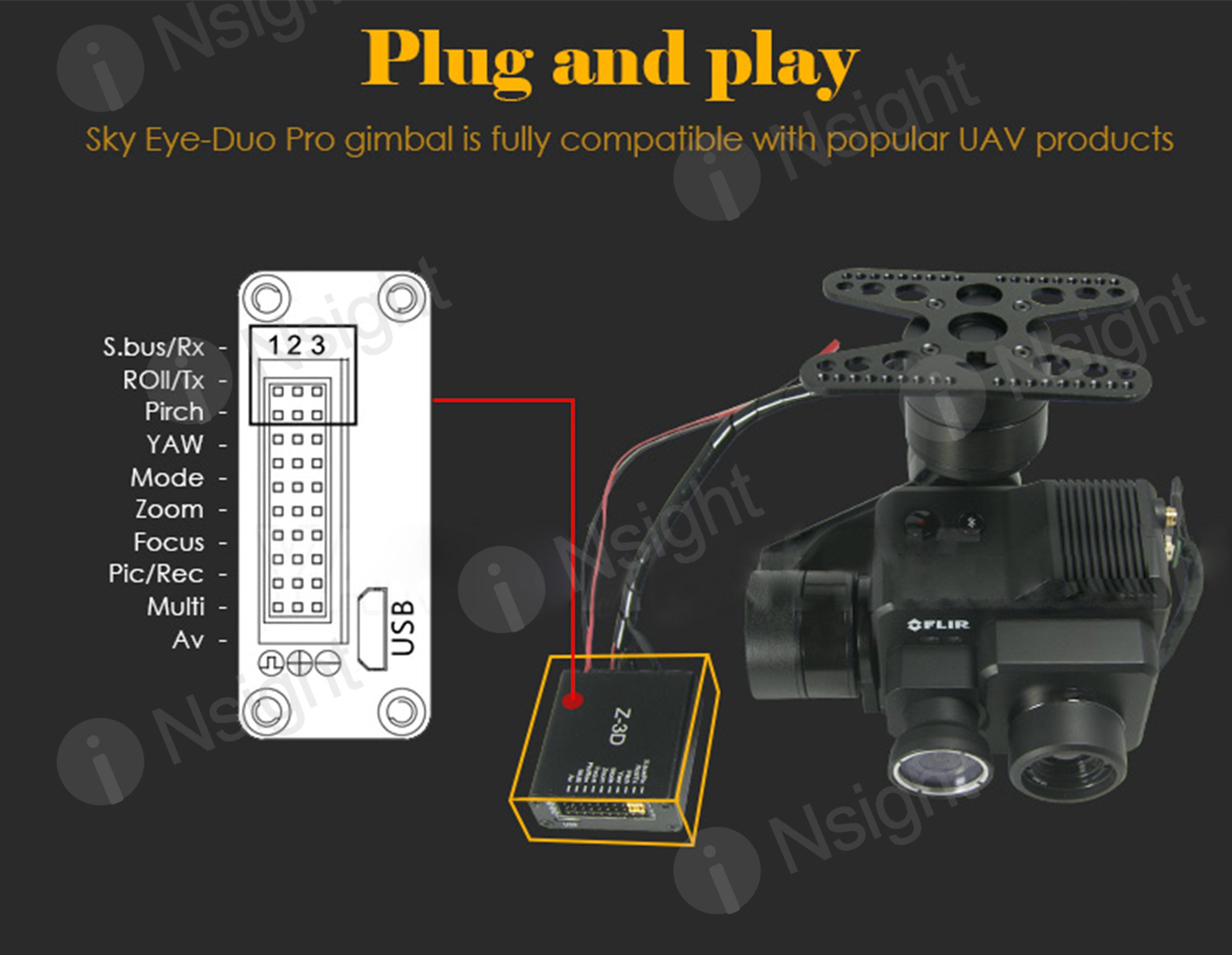 Sky Eye-Duo Pro is a 3-axis gimbal specially designed for FLIR Duo Pro R thermal camera.It is using advanced FOC(field-oriented control) motor control technology which will enable you to get a 0.02 degree incredible precise control,so the gimbal will give you crystal clear and stable video footage in the air.Micro HDMI port and 10pin JST of the thermal camera have been fed to one wiring hub which will make the wiring pretty easy and clean.Further more,GPS data will be overlaid to photo/video from daylight sensor or thermal sensor,which is very useful in applications like rescue and search.Also video streaming from daylight/thermal sensor are mixed together and will be fed via HDMI port on the wiring hub and you can switch it freely via RC controller.